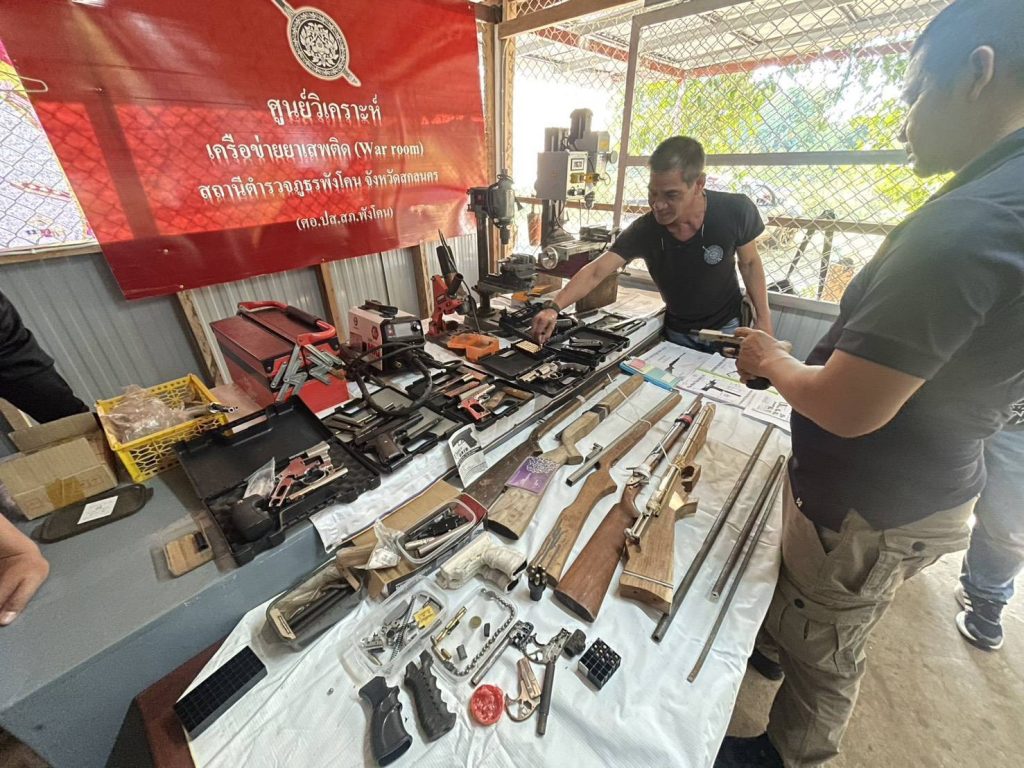 โดยจับกุมนายสกลรัตน์ อายุ 26 ปี ที่อยู่ ม.11 ต.ไฮหย่อง อ.พังโคน จ.สกลนคร แจ้งข้อหา ตัวการ ทำ ประกอบ ซ่อมแซม เปลี่ยนลักษณะ สั่ง นำ เข้า มี หรือจำหน่าย ซึ่งอาวุธหรือเครื่องกระสุนปืนสำหรับการค้าโดยไม่ได้รับอนุญาต พร้อมของกลาง -อาวุธปืนไทยประดิษฐ์ ชนิดลูกโม่ (แบลงค์กัน) จำนวน 2 กระบอก พร้อมอุปกรณ์-อาวุธปืนไทยประดิษฐ์ ชนิดกึ่งออโตเมติก(แบลงค์กัน) จำนวน 4 กระบอก พร้อมอุปกรณ์-อาวุธปืนไทยประดิษฐ์ (ชนิดปืนปากกา) จำนวน 1 กระบอก พร้อมอุปกรณ์-เครื่องกระสุนปืน ขนาด 9 มม. จำนวน 6 นัด