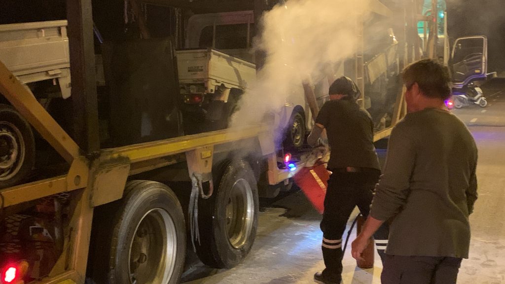 สำหรับรถบรรทุกพ่วง 18 ล้อบรรทุก 2 ชั้น ยี่ห้ออีซูสุ หมายเลขทะเบียน 70-6957 ตาก เป็นของบริษัท แม่สอดล้านนา โลจิสติกส์ ซึ่งคนขับแจ้งว่ากำลังบรรทุกรถใช้แล้วของญี่ปุ่นที่นำเข้ามาและเตรียมส่งออกไปยังประเทศเมียนมา ผ่านช่องทางของจุดผ่อนปรนบ้านห้วยผึ้งของจังหวัดแม่ฮ่องสอน เนื่องจากช่องทางที่อำเภอแม่สอดของจังหวัดตากยังคงปิดและห้ามการส่งออก ทางผู้ประกอบการจึงต้องมาขอส่งออกตามออเดอร์ที่ช่องทางของแม่ฮ่องสอน แต่ระหว่างที่ขับมาเป็นทางขึ้นและลงเขาสูงชัน จึงต้องใช้เบรกมาตลอด แต่ได้ยินเสียงระเบิดของยางจึงจอดลงมาดู ก็พบว่ามีไฟกำลังลุกไหม้และมีกลุ่มควันจำนวนมาก จึงต้องเร่งดับเพลิงในเบื้องต้น เพราะเกรงจะลุกลามไปยังรถทั้ง 8 คันที่บรรทุกมาด้วย