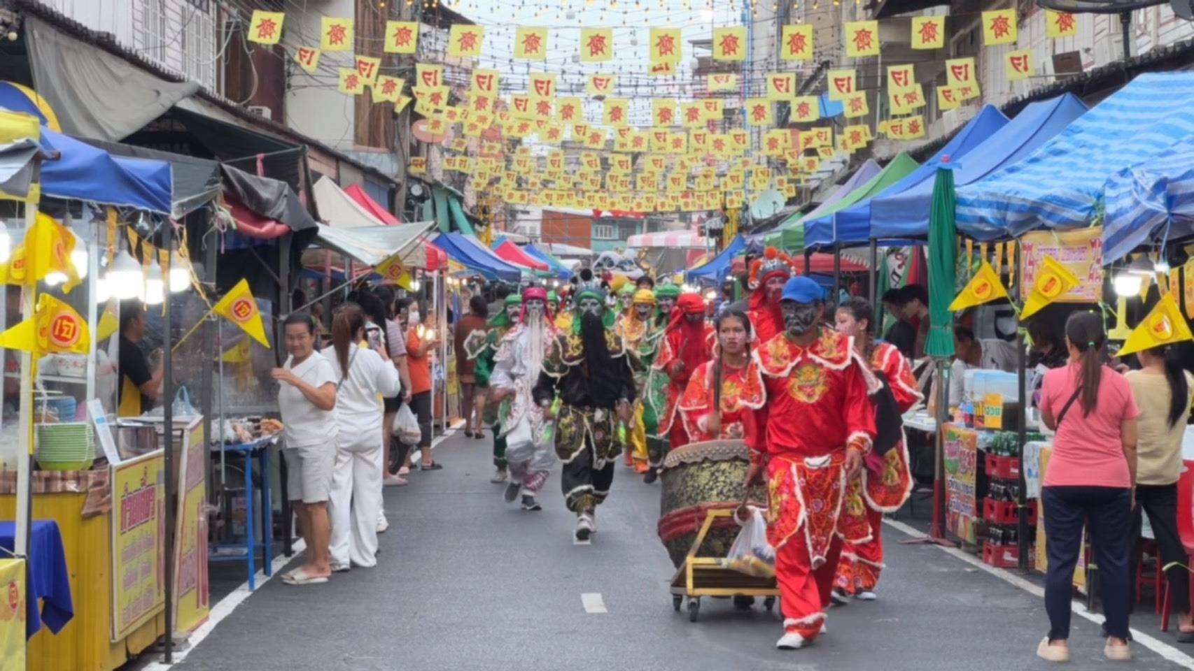 ก่อนเข้าสู่พิธีเปิด มีขบวนอัญเชิญ “เทพเจ้าเก้าพระองค์” เคลื่อนออกจากโรงเจเข่งซิ่วตั๋วไปยังริมแม่น้ำหลังวัดท่าเรือ เพื่อประกอบพิธีเชิญเสด็จกลับเข้าสู่โรงเจ ขบวนแห่เต็มไปด้วยสีสันจากธงเหลืองปักอักษรจีน ขบวน “เจ้าแม่กวนอิม” ประทับบนรถบุปผชาติ และการเชิดสิงโต มังกรจากคณะศิษย์พระนเรศ นครสวรรค์ ที่แสดงท่วงท่าอย่างสง่างามไปตามถนนสายหลักของตลาดท่าเรือ ท่ามกลางเสียงกลองเอ็งกอและประชาชนที่มายืนรอรับพรตลอดเส้นทาง