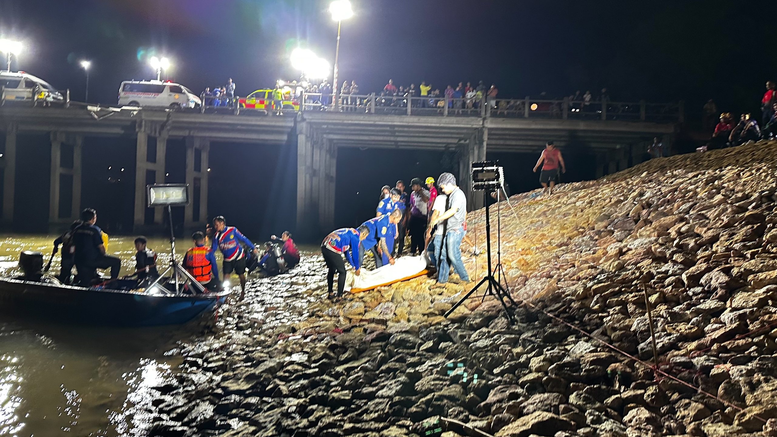 เมื่อเจ้าหน้าที่ไปถึงที่เกิดเหตุ พบว่าบริเวณราวสะพานมีร่องรอยการชนอย่างแรงจนราวสะพานหักพังเสียหาย ด้านล่างในแม่น้ำพบรถกระบะยี่ห้อโตโยต้า สีบรอนซ์ หมายเลขทะเบียน กทม. พลิกคว่ำอยู่ห่างจากสะพานประมาณ 10 เมตร เจ้าหน้าที่ประดาน้ำลงค้นหาใช้เวลาเพียง 5 นาที จึงพบผู้เสียชีวิตติดอยู่ภายในห้องโดยสาร ไม่สามารถออกมาได้ ทราบชื่อผู้เสียชีวิตคือนายชัยพร (ขอสงวนนามสกุล) อายุ 41 ปี สังกัดกรมส่งเสริมการเกษตร