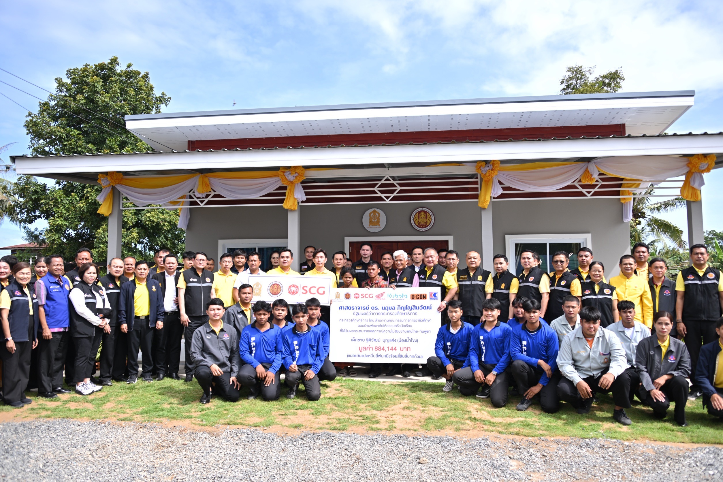 นายยศพล เวณุโกเศศ เลขาธิการ กอศ. กล่าวว่า จากเหตุการณ์ความไม่สงบในเดือนกรกฎาคมที่ผ่านมา สร้างความเสียหายต่อบ้านเรือนนักเรียนและประชาชน รมว.ศธ. จึงมอบหมายให้ สอศ. ช่วยเหลือโดยสร้างบ้านพักอาศัยหลังใหม่ พร้อมแปลงเกษตรครัวเรือนเพื่อสร้างอาชีพ และจัดหน่วยบริการ Fix It – จิตอาสา เข้าซ่อมแซมเครื่องใช้ไฟฟ้า ยานพาหนะ และสิ่งของจำเป็น โดยได้รับความร่วมมือจากสำนักงานอาชีวศึกษาจังหวัดสุรินทร์ และภาคีเครือข่ายภาคเอกชนที่ร่วมสนับสนุนวัสดุและอุปกรณ์ต่าง ๆ อาทิ บริษัท ปูนซิเมนต์ไทย จำกัด (มหาชน) หรือ SCG สนับสนุนวัสดุก่อสร้าง, บริษัท ไทยฮอนด้า จำกัด ในนามบริษัท คุณเฮงยานยนต์สุรินทร์ (1999) จำกัด มอบรถจักรยานยนต์, บริษัท สยามคูโบต้า คอร์ปอเรชั่น จำกัด สนับสนุนการซ่อมบำรุงรถแทรกเตอร์ และบริษัท ควอลิตี้คอนสตรัคชั่นโปรดัคส์ จำกัด (มหาชน) มอบอิฐก่อสร้าง