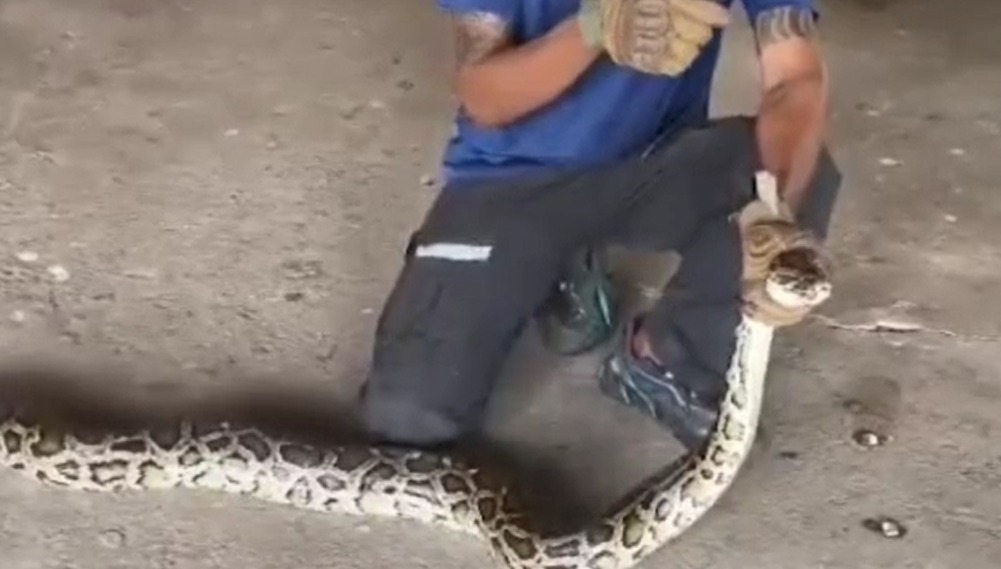 หลังรับแจ้งจึงได้นำอุปกรณ์ รุดไปตรวจสอบ ที่ฟาร์มไก่ชนดังกล่าว พบกับนายยงค์ ทับทัย อายุ 63 ปี เจ้าของฟาร์มดังกล่าว พร้อมกับพาเจ้าหน้าที่ไปดูที่เล้าไก่ก็พบงูเหลือมขนาดใหญ่กำลังเลื้อยอยู่บนอิฐบล็อคที่ใช้กั้นไว้สำหรับเลี้ยงไก่ชนในฟาร์มดังกล่าว จากนั้นจึงได้สวมถุงมือเพื่อใช้สำหรับจับงู โดยใช้มือเปล่าในการจับเพราะงูเหลือมจะเคลื่อนตัวช้าและยังมีอาการเหนื่อยจากการย่อยไก่อยู่ เจ้าหน้าที่ใช้เวลาประมาณ15นาที จึงทำการจับงูได้สำเร็จ ท่ามกลางความตกใจของไก่ที่อยู่ในเล้าต่างร้องกะต๊าก ลั่นคอกเพราะกลัวจะถูกงูมาเขมือบกินกันยกเล้า จากนั้นเจ้าหน้าที่ก็จับงูใส่ถึงเพื่อเตรียมไปปล่อยในที่ที่ปลอดภัย