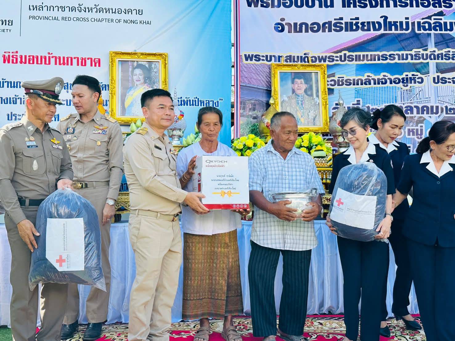 วันที่ 28 ต.ค.2568 เวลา 13.30 น. นายสมภพ สมิตะสิริ ผู้ว่าราชการจังหวัดหนองคาย เป็นประธานในพิธีมอบบ้านโครงการ “บ้านกาชาดสร้างสุขจังหวัดหนองคาย” เพื่อเฉลิมพระเกียรติ สมเด็จพระนางเจ้าสิริกิติ์ พระบรมราชินีนาถ พระบรมราชชนนีพันปีหลวง ประจำปี พ.ศ.2568 และโครงการก่อสร้างบ้านผู้ยากไร้เฉลิมพระเกียรติ พระบาทสมเด็จพระปรเมนทรรามาธิบดีศรีสินทรมหาวชิราลงกรณ พระวชิรเกล้าเจ้าอยู่หัว ประจำปี 2568 ให้กับ นายแก้ว วระวัด ขาวบ้านเจียมปรางค์ หมู่ที่ 4 ต.พานพร้าว อ.ศรีเชียงใหม่ จ.หนองคาย โดยมี นายจรัล กลางประดิษฐ นายอำเภอศรีเชียงใหม่ กล่าวรายงาน มีนางอ้อมขวัญ คงทัน ที่ปรึกษานายกเหล่ากาชาดจังหวัดหนองคาย , นางชุติมา ช่างเหล็ก รองนายกเหล่ากาชาดจังหวัดหนองคาย , นายภุชงค์ ชานันโท นายกเทศมนตรีตำบลศรีเชียงใหม่ พร้อมด้วยกรรมการและสมาชิกเหล่ากาชาดจังหวัดหนองคาย , หัวหน้าส่วนราชการ หน่วยงาน สมาชิกสภาเทศบาล ผู้นำชุมชน ชาวบ้าน และองค์กรปกครองส่วนท้องถิ่น เข้าร่วมในพิธีรับมอบบ้านฯ