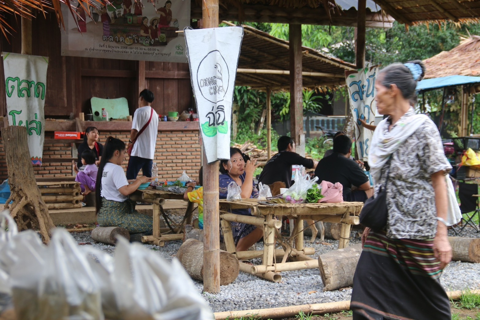มีเสียงสัมภาษณ์ น.ส.อิสรีย์ วนาวิเศษศักดิ์ (ผู้ร่วมก่อตั้งตลาด โผล่ง สะนี่พุงเพี่ย) จำปา ร่มไพรงาม (ชาวบ้านที่นำของมาขาย)