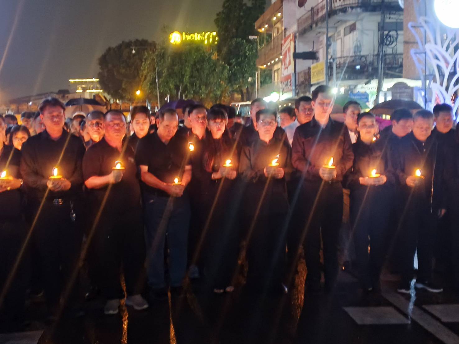 จากนั้นนายอัศนี ได้นำคณะผู้บริการ สมาชิกสภา หัวหน้าส่วนราชการ ข้าราชการ และผู้นำชุมชนของเทศบาล หรือชาวบ้านเรียกว่า “เจดีย์ขาว” ทำพิธีจุดผางประทีปถวายความอาลัยแด่สมเด็จพระนางเจ้าสิริกิติ์ พระ บรมราชินีนาถ พระบรมราชชนนีพันปีหลวง พร้อมยืนสงบนิ่งเป็นเวลา 93 วินาที ก่อนมีการแสดงแสงสีเสียง ชุดล้านนา ซิมโฟนี่ ออฟ ไลท์ สถิตกลางใจประชาราษฎร์ด้วยสำนึกในพระมหากรุณาธิคุณ ตราบนิจนิรันดร์ท่ามกลางตื่นตาตื่นใจของนักท่อง เที่ยวจำนวนมาก