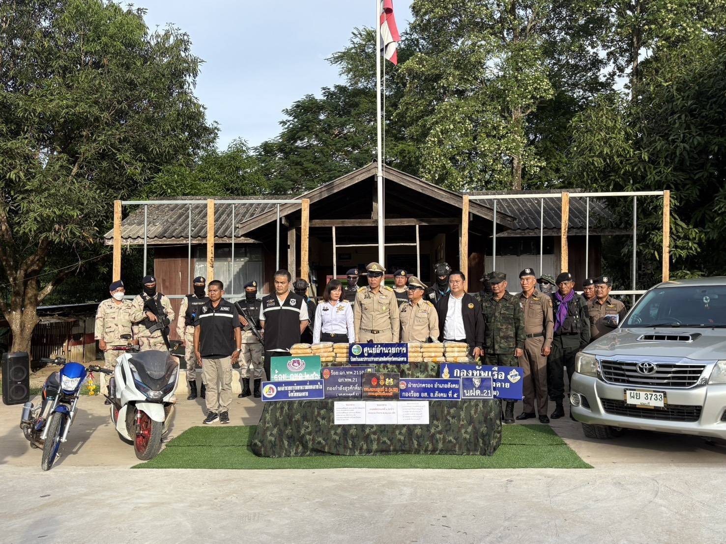 วันที่ 6 พ.ย.68 ที่ กองร้อยเฉพาะกิจทหารพรานที่ 2110 หน่วยเฉพาะกิจกรมทหารพรานที่ 21 กองบังคับการควบคุมที่ 2 กองกำลังสุรศักดิ์มนตรี อ.สังคม จ.หนองคาย นายไพฑูรย์ มหาชื่นใจ รองผู้ว่าราชการจังหวัดหนองคาย,นางสาววรรณา ผู้อุตส่าห์ นายด่านศุลกากรหนองคาย,นายนวน โทบุตร นายอำเภอสังคม ,พ.อ.ศรณณัฐ นวนมณี ผบ.ฉก.ทพ.21, ผกก.สภ.สังคม, ร.อ.ยุทธณา สีไชย์ ผู้บังคับกองร้อยเฉพาะกิจทหารพรานที่ 2110 หน่วยเฉพาะกิจทหารพรานที่ 21, หน่วยเรือสังคม นรข.เขตหนองคาย, กอ.รมน.จว.หนองคาย,ชุดสืบ ภจว.หนองคาย และหน่วยงานความมั่นคงในพื้นที่ แถลงผลการจับกุม 2 ผู้ต้องหาชาวอุดรธานี ได้พร้อมของกลางยาบ้า 202,000 เม็ด ได้ที่บริเวณข้างเมรุ บ้านแก้งใหม่ ต.สังคม อ.สังคม จ.หนองคาย ทราบชื่อต่อมา คือ นายกิตติพงษ์ (กอ) อายุ 25 ปี และ นายภาคภูมิ (เก๋ง) อายุ 19 ปี ทั้ง 2 เป็นชาว ต.หนองแวง อ.น้ำโสม จ.อุดรธานี ขณะกำลังพยายามลักลอบนำยาบ้าดังกล่าวเข้ามาในประเทศ ขยายผลติดตามตรวจยึด รถ.จยย. 2คัน รถยนต์กระบะโตโยต้า 1 คัน การจับกุมครั้งนี้ภายใต้อำนวยการโดย พล.ต.มงคล หอทอง ผบ.กกล.สุรศักดิ์มตรี,พ.อ.ศรณณัฐ นวนมณี ผบ.ฉก.ทพ.21ผบ.ฉก.ทพ.21,พ.อ.อุดมการณ์ ศรีแขไตร รองผู้บังคับการกองบังคับการควบคุมที่ 2 (ร.13)