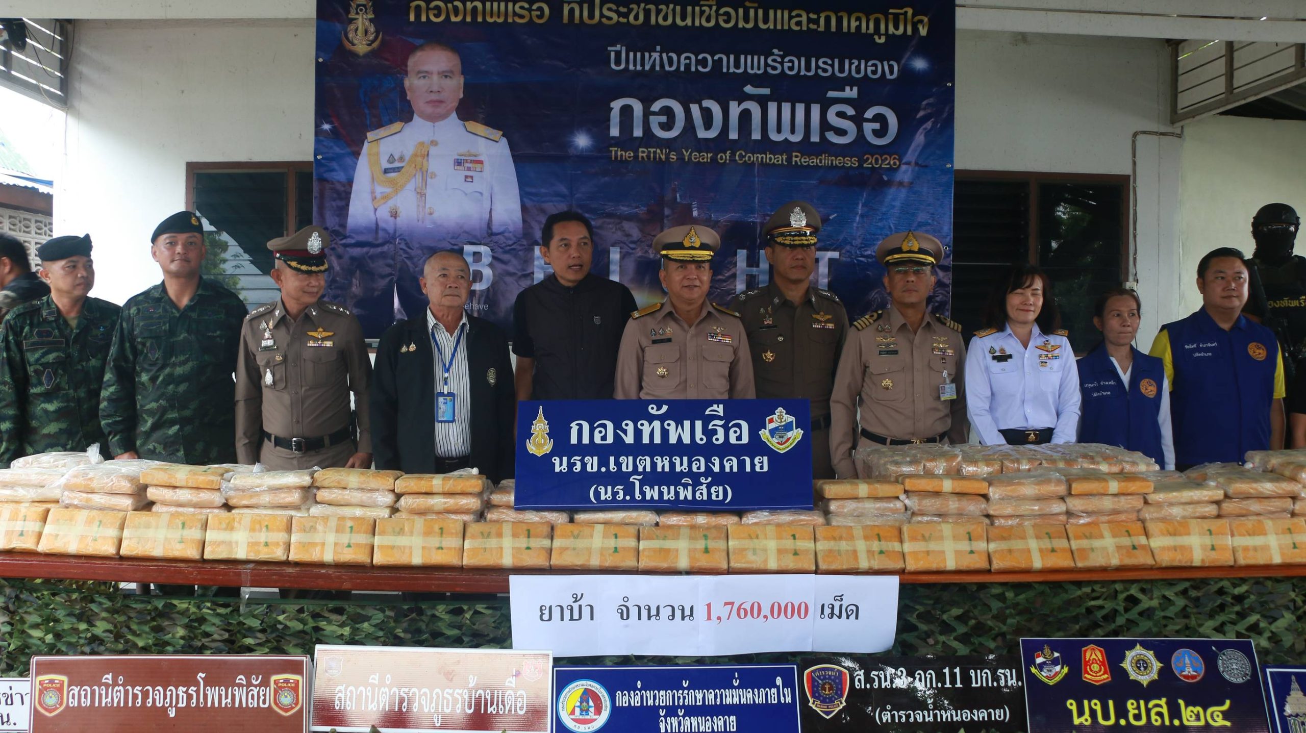 วันที่ 8 พ.ย.2568 ที่ หน่วยเรือโพนพิสัย หน่วยเรือรักษาความสงบเรียบร้อยตามลำแม่น้ำโขง เขตหนองคาย พล.ร.ต.ณรงค์ เอมดี ผบ.นรข.,นายไพฑรูย์ มหาชื่นใจ รองผู้ว่าราชการจังหวัดหนองคาย,พล.ต.ต.อัทธชนม์ ช่วงงาม ผบก.ภ.จว.หนองคาย,พ.อ.เรวัฒ ธรรมจิรเดช เสธ.กกล.สุรศักดิ์มนตรี,นาวาเอก วิศิษฐ์พงศ์ เจริญวิชยเดช ผู้บังคับหน่วยเรือรักษาความสงบเรียบร้อยตามลำแม่น้ำโขง เขตหนองคาย,นางสาววรรณา ผู้อุตส่าห์ นายด่านศุลกากรหนองคาย,พ.อ.อุดมการณ์ ศรีแขไตร รอง ผบ.บก.ควบคุมที่ 2 (ร.13) ร.อ.ภาสพล สีทองเกตุ หน.หน่วนเรือโพนพิสัย,สภ.โพนพิสัย,ฝ่ายปกครองอำเภอโพนพิสัย ,สภ.บ้านเดื่อ,ฉก.ทพ 2105,และหน่วยงานความมั่นคง ร่วมกันแถลงผลการจับกุมผู้ต้องหา 3 ราย ยาบ้าจำนวนกว่า 1.76 ล้านเม็ด ซุกในกระเป๋าผ้า ใบ รถยนต์ 2 คัน ได้ที่บริเวณริมฝั่งแม่น้ำโขง หลังโรงเรียนบ้านพวก ต.บ้านเดื่อ อ.เมือง จ.หนองคาย ขณะมาขนยาบ้า ทราบชื่อภายหลัง นายสิทธิชัย อายุ 49 ปี อยู่บ้านทรายทอง ต.บ้านจันทร์ อ.บ้านดุง จ.อุดรธานี นายเพชร อายุ 40 ปี อยู่บ้านม่วง ต.บ้านม่วง อ.บ้านดุง จ.อุดรธานี และนายศุภวิชญ์ อายุ 16ปี อยู่บ้านห้วยทราย ต.ห้วยหลวง อ.บ้านม่วง จ.สกลนคร รถเก๋ง Chevrolet สีดำ ทะเบียน กค บึงกาฬ และรถกระบะ Isuzu สีเทา ทะเบียน เชียงราย