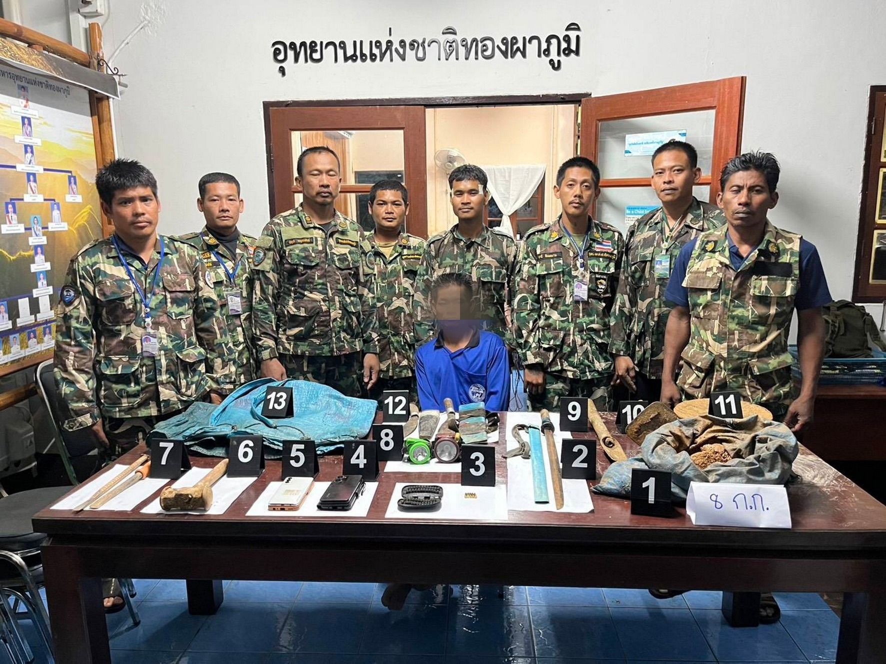 หลังจากนั้นเจ้าหน้าที่จึงกระจายกำลังกันออกตรวจสอบตามหลุมที่ถูกขุดเจาะหาแร่ทองคำ ปรากฎว่าพบมีคนเข้าไปหลบซ่อนตัวอยู่ภายในหลุม เป็นชาย 1 ราย เจ้าหน้าที่จึงเรียกให้ออกมาเพื่อมอบตัว ทราบชื่อต่อมาคือนายโซเอะเกตุ (ไม่มีนามสกุล)ชาวพม่า อายุ 34 ปี พบของกลาง ประกอบด้วยกระสอบบรรจุดินสายแร่ทองคำ หนัก 8 กิโลกรัม รวมถึงมีดดาบ เครื่องกระสุนปืน .22 LR จำนวน 5 นัด โทรศัพท์มือถือ 2 เครื่อง และอุปกรณ์ขุดดินและร่อนแร่ทองคำชนิดอื่นๆ รวม 13 รายการ เจ้าหน้าที่จึงตรวจยึดเอาไว้เป็นของกลาง จากนั้นจึงคุมตัวผู้ต้องหามอบสอบปากคำเพิ่มเติมที่อุทยานแห่งชาติทองผาภูมิ แต่กว่าจะมาถึงต้องใช้เวลานานหลายชั่วโมง