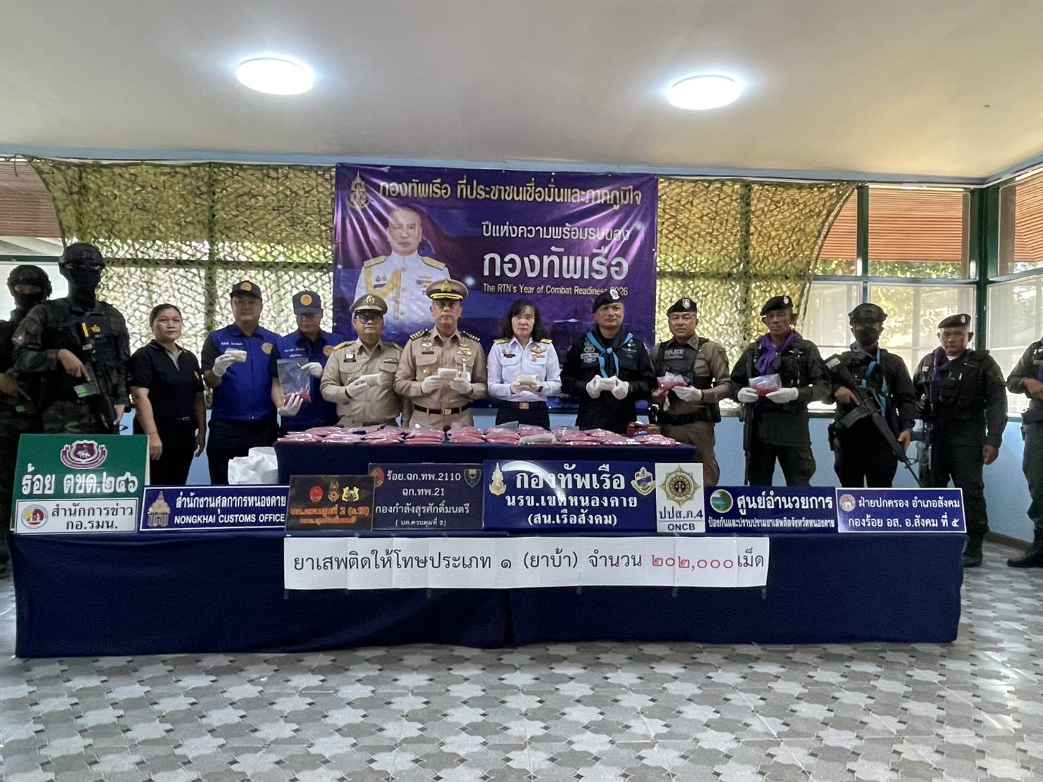 วันที่ 9 พ.ย..68 ที่ สถานีเรือสังคม หน่วยเรือรักษาความสงบเรียบตามลำแม่น้ำโขง เขตหนองคาย อ.สังคม จ.หนองคาย น.อ.วิศิษฐ์พงศ์ เจริญวิชยเดช ผบ.นรข.เขตหนองคาย นางสาววรรณา ผู้อุตส่าห์ นายด่านศุลกากรหนองคาย นายนวน โทบุตร นอภ.สังคม ร.อ.ไพรสน พลเสน หน.สน.เรืองสังคม นรข.เขตหนองคาย ร.อ.ยุทธณา สีไชย์ ร้อย ฉก.ทพ.2110 ฉก.ทพ.21 และหน่วยงานความมั่นคงในพื้นที่ แถลงข่าวการตรวจยึดยาบ้าจำนวนกว่า202,000 เม็ด ได้ที่บริเวณริมฝั่งแม่น้ำโขงด้านหลังรีสอร์ทแห่งหนึ่งใน อ.สังคม