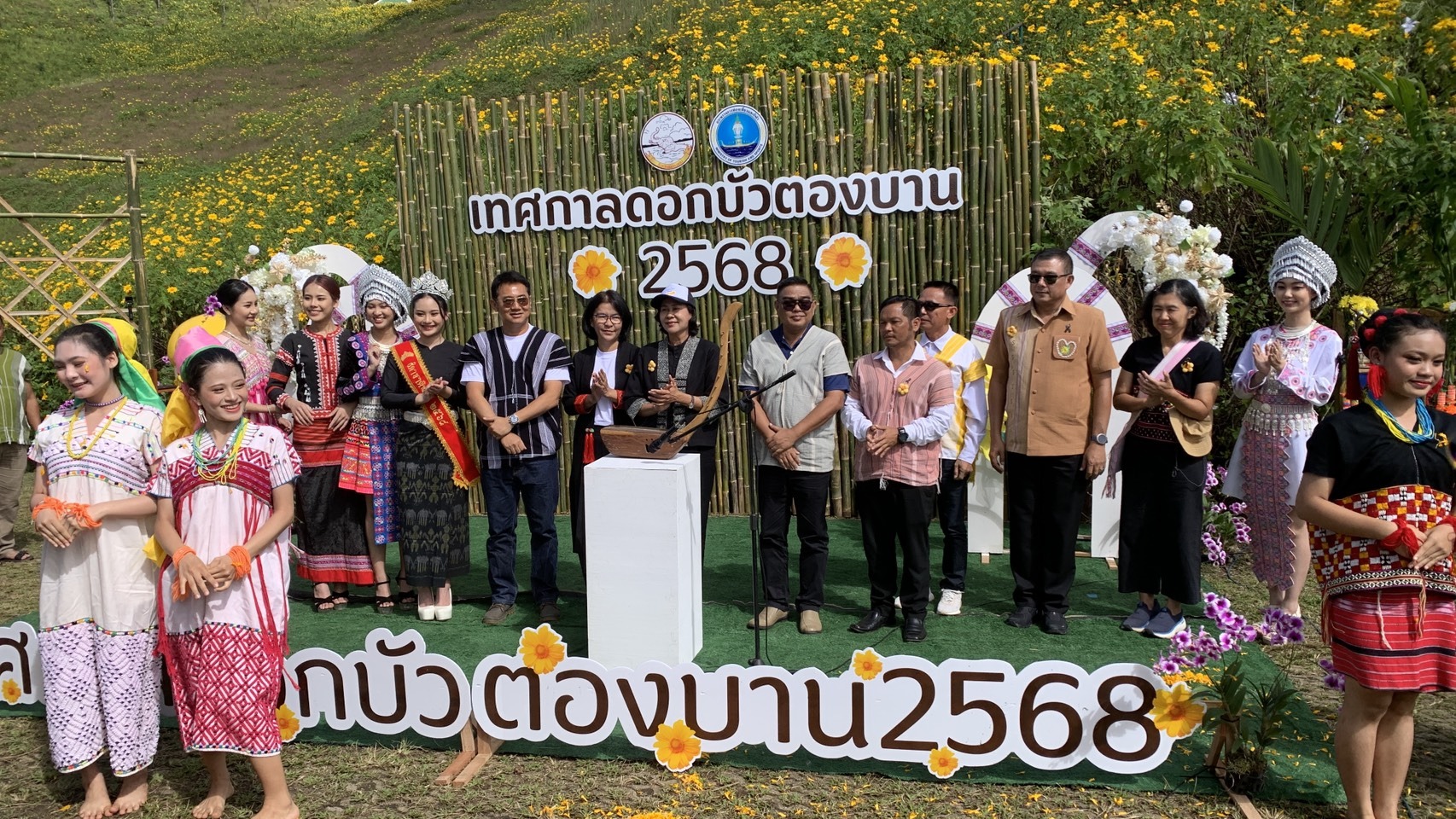 ช่วงเช้าของวันนี้ (วันที่ 11 พฤศจิกายน 2568) ที่ลานศาลาแปดเหลี่ยม บนยอดดอยของวนอุทยานทุ่งบัวตองดอยแม่อูคอ ตำบลแม่อูคอ อำเภอขุนยวม จังหวัดแม่ฮ่องสอน นางชุติพร เสชัง ผู้ว่าราชการจังหวัดแม่ฮ่องสอน เป็นประธานในพิธีเปิดโครงการส่งเสริมการท่องเที่ยวเชิงกีฬา ดนตรีและศิลปะ ส่งเสริมการท่องเที่ยวเทศกาลดอกบัวตองบานดอยแม่อูคอ ประจำปี 2568 มีนักท่องเที่ยว ประชนและองค์กรปกครองในพื้นที่เข้าร่วมในกิจกรรมจำนวนมาก ท่ามกลางทุ่งดอกบัวตองที่บานรับสายฝนไปแล้วกว่าร้อยละ 80 โอบล้อมด้วยทะเลหมอกของช่วงปลายฝนต้นหนาวอย่างเย็นสบาย แม้ว่าจะมีฝนตกลงมาอยู่เป็นระยะๆ แต่นักท่องเที่ยวก็ยังยืนยันว่าสมใจที่ได้ชมความสวยงามของกลีบดอกบัวตองที่ชุ่มฉ่ำด้วยไอหมอกกับฝนห้วงเวลานี้ ที่ไม่บ่อยนักที่จะมีโอกาสได้สัมผัสกับบรรยากาศแบบนี้
