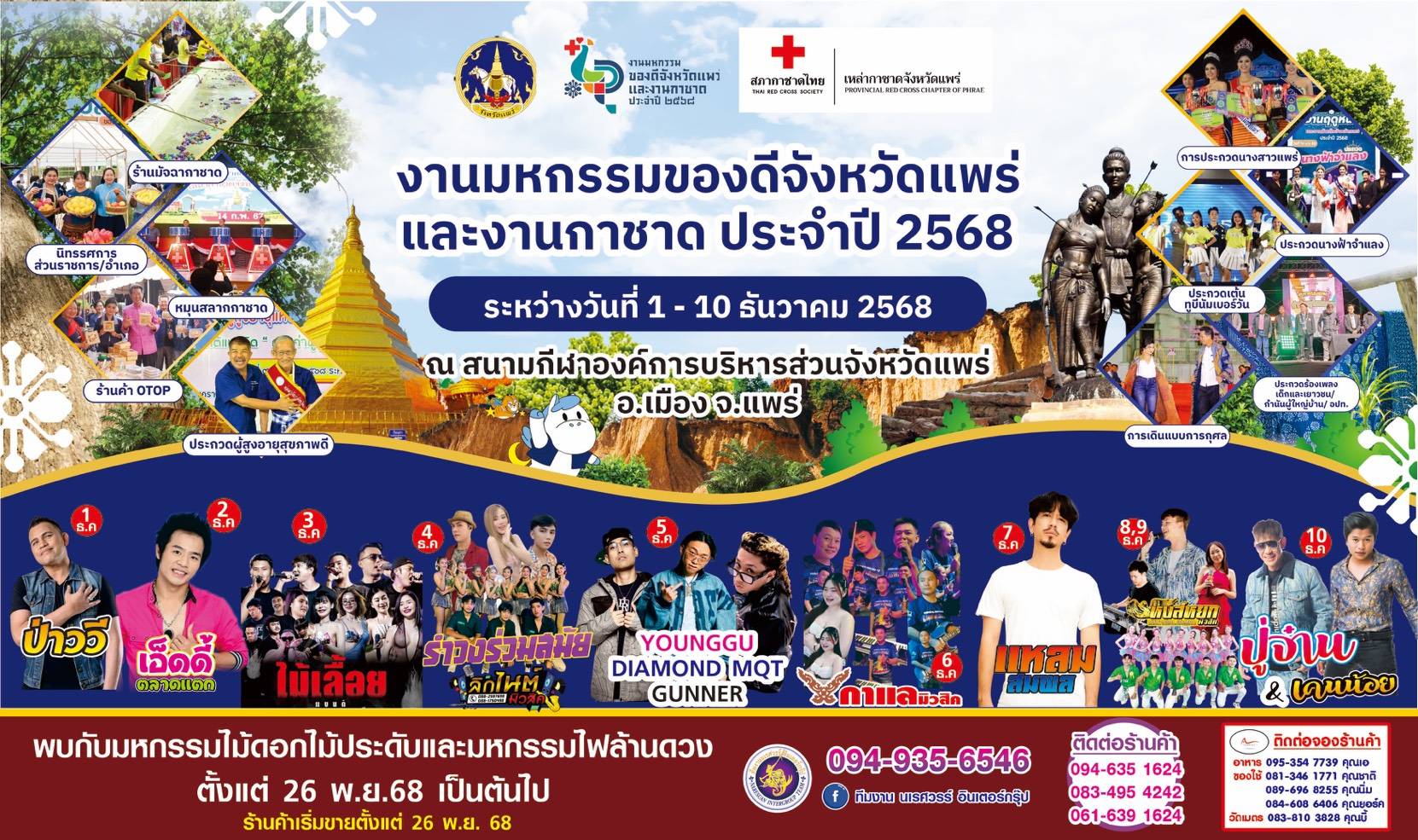 จังหวัดแพร่ขอเชิญชวนประชาชนและนักท่องเที่ยวร่วมชมงาน ระหว่างวันที่ 1 – 10 ธันวาคม 2568 ณ สนามกีฬาองค์การบริหารส่วนจังหวัดแพร่ ร่วมอุดหนุนสินค้า ร่วมทำบุญกับกาชาด และสัมผัสมนต์เสน่ห์เมืองแป้ด้วยกัน