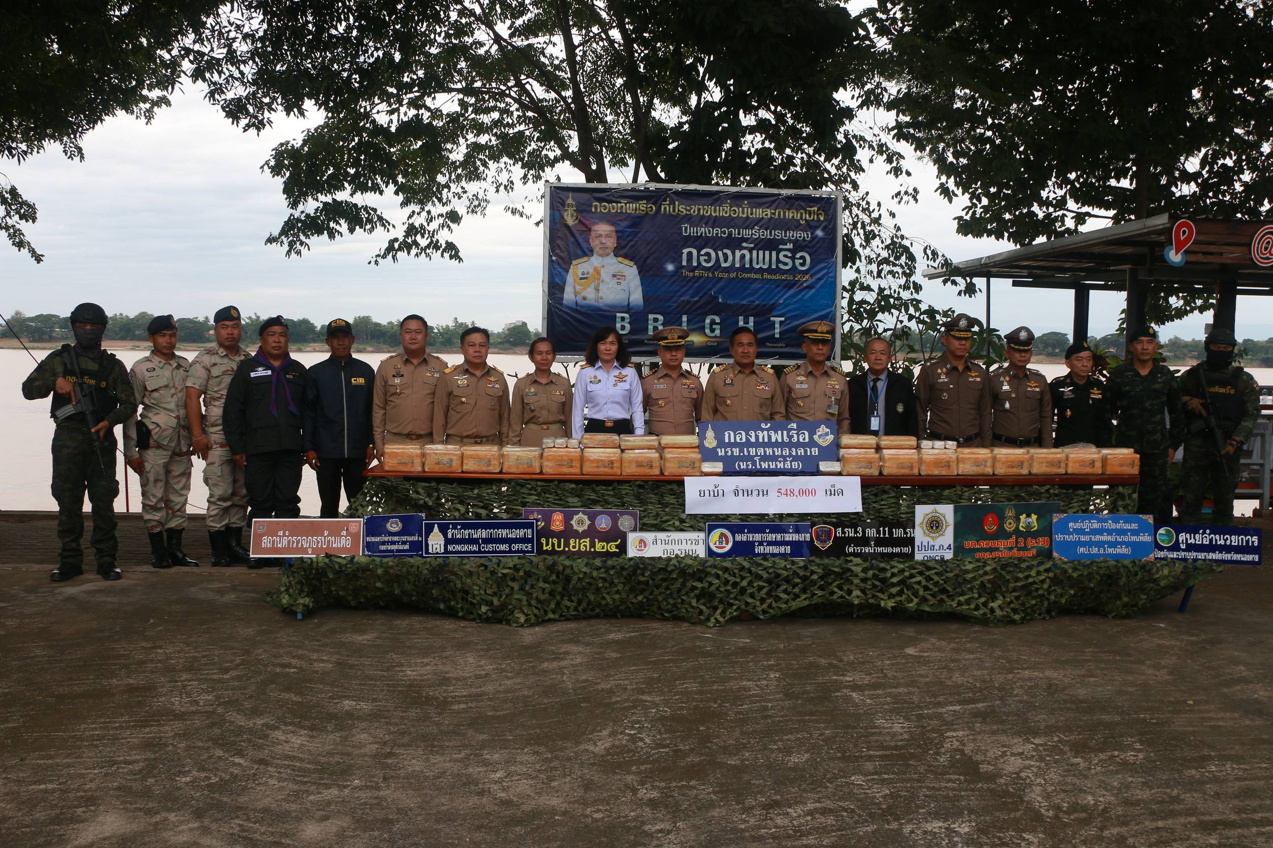 วันที่ 17 พ.ย.2568 ที่ หน่วยเรือโพนพิสัย หน่วยเรือรักษาความสงบเรียบร้อยตามลำแม่น้ำโขง เขตหนองคาย,นายศรัญย์ศักดิ์ ศรีเครือเนตร ผู้ว่าราชการจังหวัดหนองคาย,พล.ต.ต.อัทธชนม์ ช่วงงาม ผบก.ภ.จว.หนองคาย,น.อ.ชลทัย รัตนเรือง รอง ผบ.นรข.,นาวาเอก วิศิษฐ์พงศ์ เจริญวิชยเดช ผู้บังคับหน่วยเรือรักษาความสงบเรียบร้อยตามลำแม่น้ำโขง เขตหนองคาย,นางสาววรรณา ผู้อุตส่าห์ นายด่านศุลกากรหนองคาย,พ.ท.อัครพนธ์ จันทร์สงค์ ผบ.ร.13 พัน 1 บก.ควบคุมที่ 2,ร.อ.ภาสพล สีทองเกตุ หน.หน่วยเรือโพนพิสัย,ฉก.ทพ 2105 ฉก.ทพ.21,สภ.บ้านเดื่อ,ฝ่ายปกครอง,และหน่วยงานความมั่นคง ร่วมกันแถลงผลการจับกุม นายสนธยา สมจันที อายุ 43 ปี ผู้ต้องหา ชาวบ้านฝายแตก ต.สีกาย อ.เมืองหนองคาย ได้พร้อมยาบ้าจำนวนกว่า 5.4 แสนเม็ด บรรจุในกระสอบ 2 ใบ ได้ที่บริเวณสวนกล้วยริมฝั่งแม่น้ำโขงด้านหลังวัดศิริวาลุกาลัย บ้านหัวหาด ต.บ้านเดื่อ อ.เมืองหนองคาย หลังพยายามลักลอบนำเข้ายาบ้าจากประเทศเพื่อนบ้าน