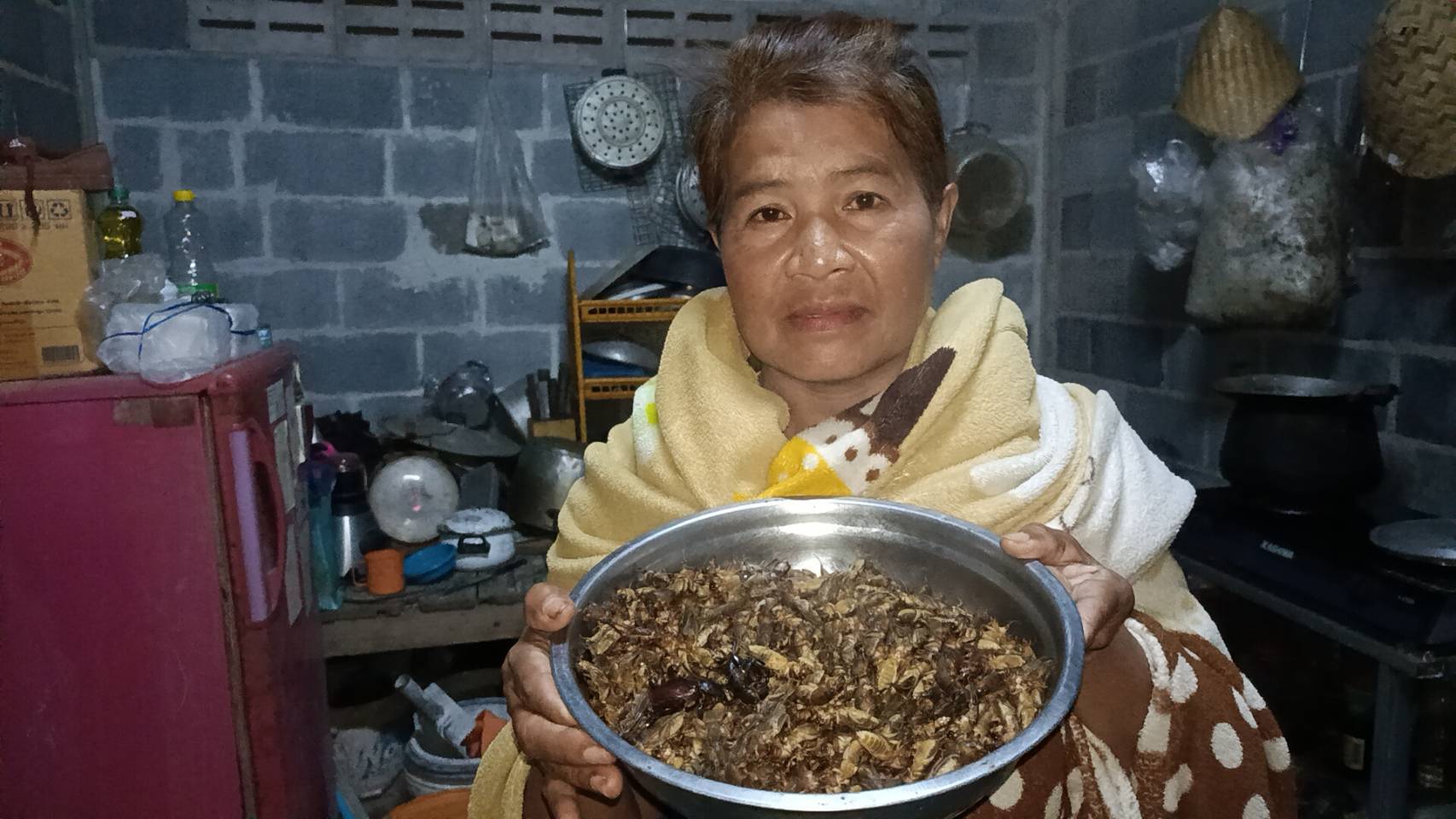 นางปน คำเรียบร้อยชาวบ้านกล่าวว่าได้ทำที่ดักจับแมงกระชอนที่หน้าบ้าน โดยใช้ภูมิปัญญาชาวบ้านง่ายๆขุดหลุมลึกประมาณ 20 เซนติเมตรกว้าง 1 เมตร ลองก้นหลุมด้วยพลาสติกเทน้ำใสลงไปในหลุมพอประมาณ จากนั้นจะใช้เสียงล่อโดยเปิดลำโพงบลูทูธเป็นเสียงแมงกระชอน ใช้ไฟสีม่วงแขวนไว้ด้านบนปากหลุม ข้างล่างจะใช้เป็นไฟสีชมพูล่อถึงจะมา ถ้าไม่เปิดเสียงมันก็จะไม่มาจ้ะ เมื่อแมงกระชอนได้ยินเสียงก็จะพาออกมาตกลงไปในหลุมที่มีน้ำขัง จากนั้นก็รอตักใส่ภาชนะแล้วเอามานึ่ง ถ้าขายเป็นตัวจะขายร้อยละ 70 บาท ซึ่งจะมีพวกนักตกปลามาซื้อ ถ้าเอามานึ่งเพื่อที่จะขายต่อให้กับร้านขายแมลงทอดก็จะมีแม่ค้าพ่อค้ามารับซื้อถึงที่บ้าน ขายกิโลกรัมละ 160 บาท เฉลี่ยคืน 1 ได้แมงกระชอน 2 กิโลกรัม หน้าร้อนจะได้มากกว่า 2 กิโลกรัม ตอนนี้หน้าหนาวจะได้คืนละ 1 กิโลกรัมโดยเปิดเสียงแมงกระชอนไว้ทั้งคืน ก่อน 6 โมงเช้าก็จะช้อนเอาตัวแมงกระชอนใส่ภาชนะไปนึ่งเพื่อรอขายส่งให้ลูกค้าต่อไป