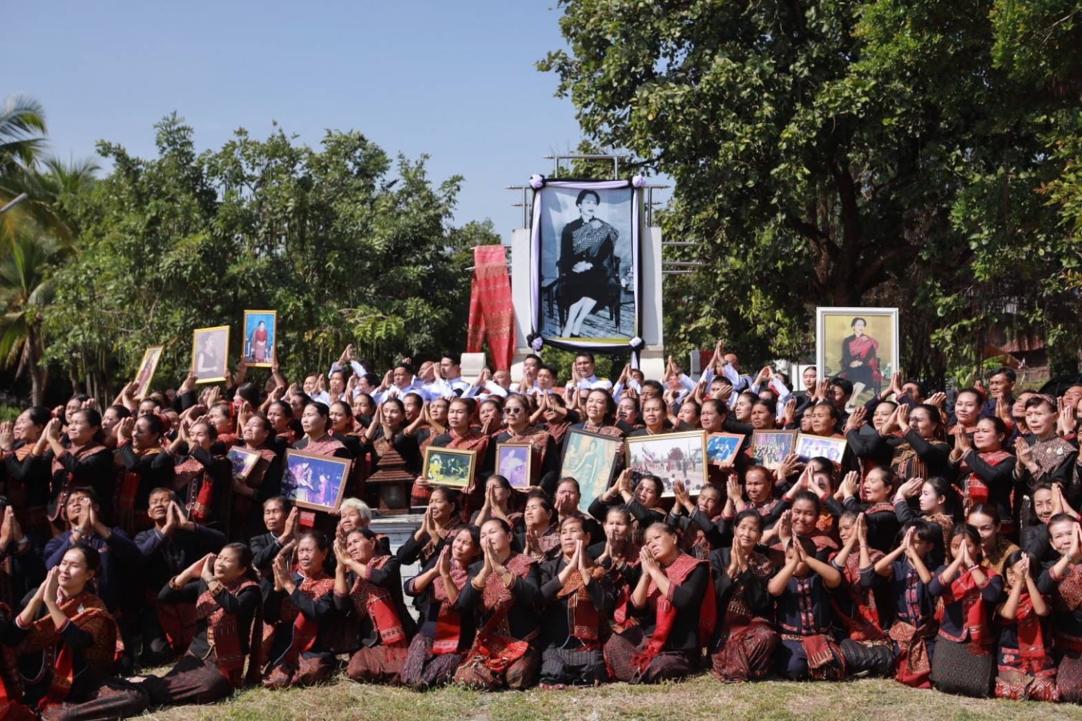กลุ่มสตรีชาวผู้ไทยบ้านโพนโชว์ผ้าไหมวิจิตรแพรวา ยาว 60 ม. 60 ลาย ต้นแบบลายโบราณ “ผืนผ้าแห่งแผ่นดิน” ย้อนรำลึก 43 ปี พระพันปีหลวงเสด็จเยี่ยมพสกนิกรชาวบ้านโพน จังหวัดกาฬสินธุ์
