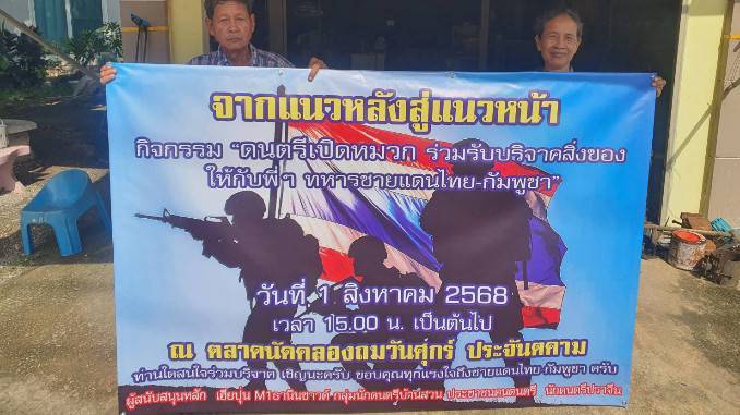 วันที่ 1 สค.68 ณ บริเวณตลาดนัดคลองถมวันศุกร์ อ.ประจันตคาม จ.ปราจีนบุรี กลุ่มนักดนตรีบ้านสวนร่วมกับประชาชนดนตรีปราจีนบุรี จัดกิจกรรมดนตรีเปิดหมวกบริจาคสิ่งของช่วยทหารชายแดน โดยจัดนักร้องร้องเพลงให้กับประชาชนที่มาร่วมบริจาคสิ่งของและเงินสด ในกิจกรรมดังกล่าวมีพี่น้องประชาชนร่วมบริจาคน้ำดื่ม บะหมี่กึ่งสำเร็จรูป ไข่ไก่และร่วมบริจาคเงินสดคนละเล็กคนละน้อย เพื่อที่จะมอบให้ทหารที่ปฏิบัติหน้าที่อยู่ตามแนวชายแดน