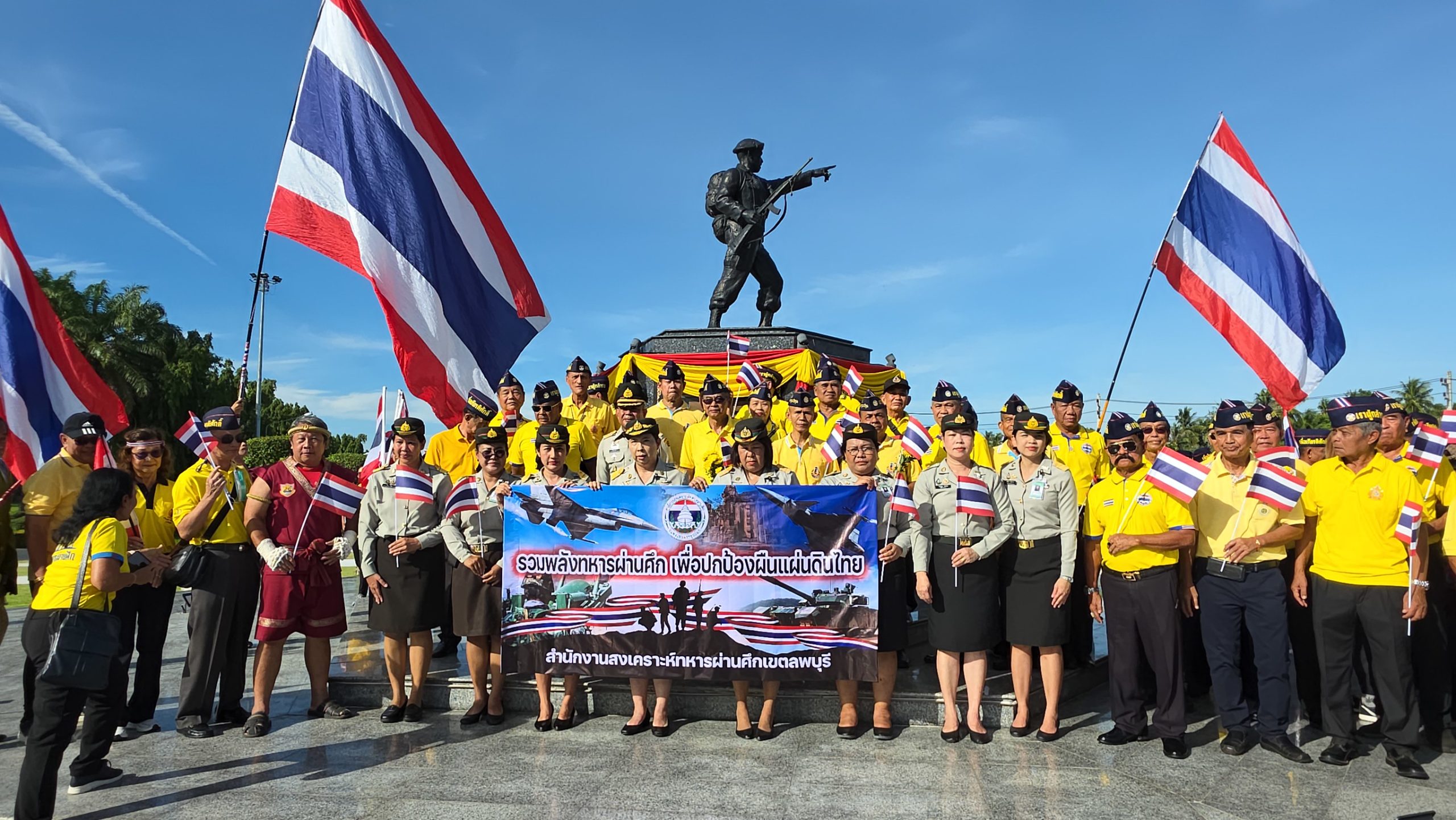 ทหารผ่านศึก กว่า 300 คน ร่วมร้องเพลงชาติและโบกธงไทย หน้าอนุสาวรีย์ทหารพลร่ม เพื่อสดุดีผู้เสียสละจากเหตุสู้รบชายแดนไทย–กัมพูชา และจังหวัดชายแดนภาคใต้