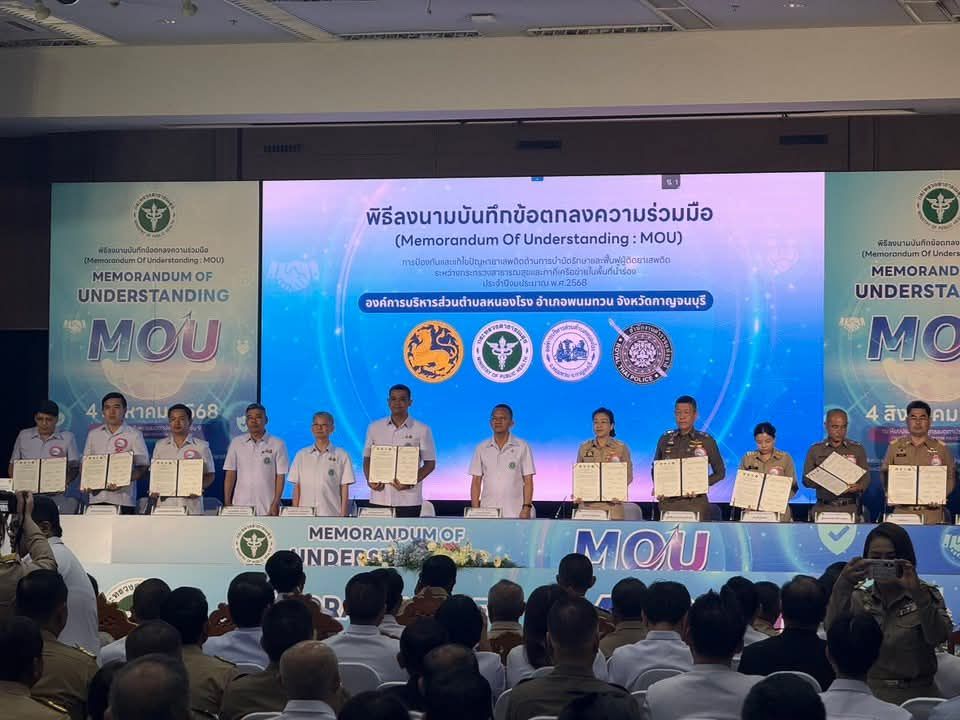 วันที่ 4 สิงหาคม 2568 ผู้สื่อข่าวรายงานว่า ณ ห้องประชุมสัมพุทธเมตตาประชารักษ์ ชั้น 9 กรมสนับสนุนบริการสุขภาพ กระทรวงสาธารณสุข นายอธิสรรค์ อินทร์ตรา ผู้ว่าราชการจังหวัดกาญจนบุรี มอบหมายให้ นางพรรณวิภา ปิยัมปุตระ รองผู้ว่าราชการจังหวัดกาญจนบุรี เข้าร่วมพิธีลงนามบันทึกข้อตกลงความร่วมมือ การป้องกันและแก้ไขปัญหายาเสพติดด้านการบำบัดรักษาและฟื้นฟูผู้ติดยาเสพติด ระหว่างกระทรวงสาธารณสุขและภาคีเครือข่ายในพื้นที่นำร่อง 8 จังหวัด