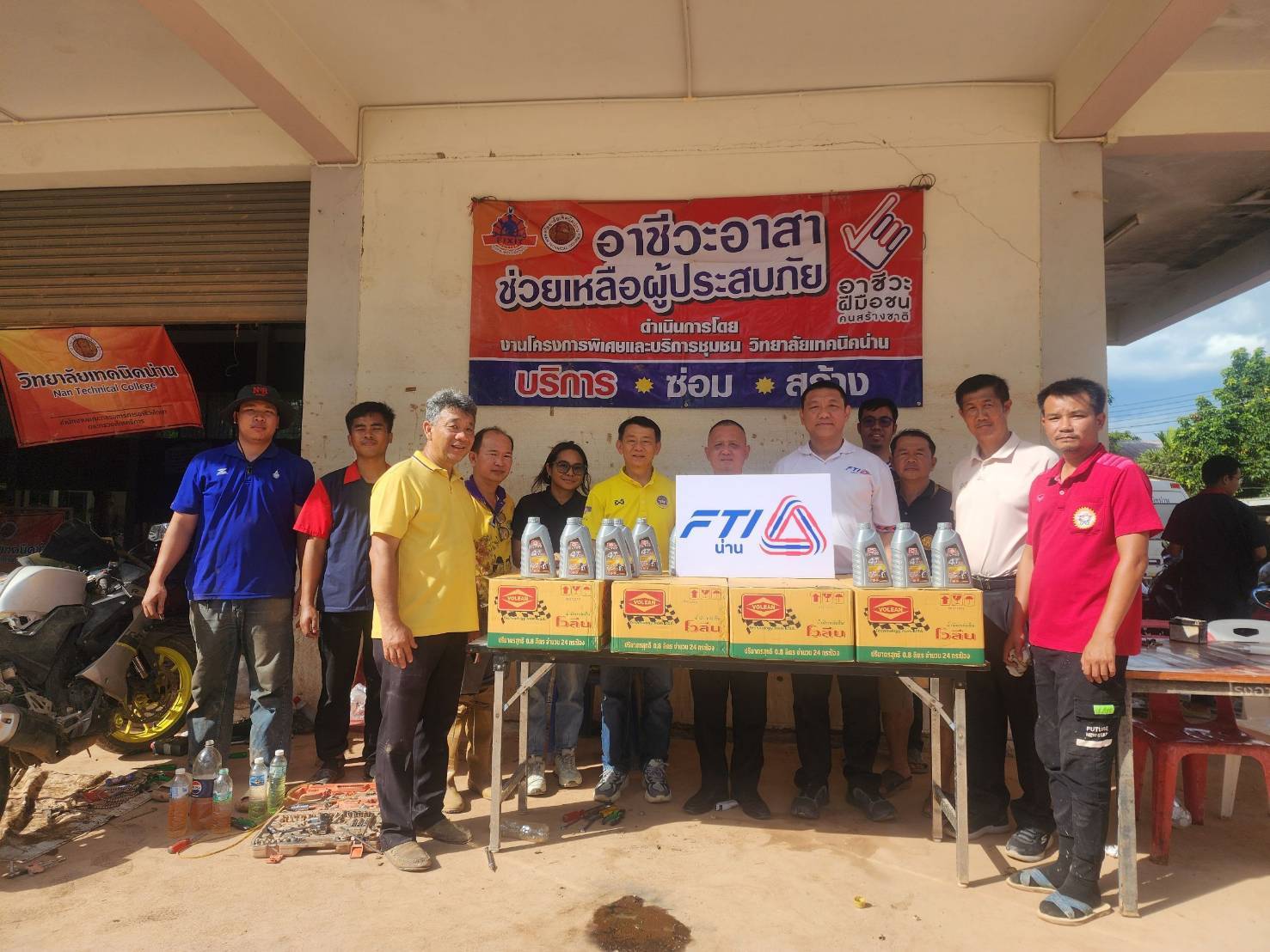 นายสุเทพ วงศ์วิเศษ ประธานอุตสาหกรรมจังหวัดน่าน และ นายเดชา สงค์ประเสริฐ ประธานกิตติมศักดิ์สภาอุตสาหกรรมจังหวัดน่าน ได้มอบน้ำมันเครื่องรถจักรยานยนต์ เพื่อสนับสนุนการปฏิบัติงานของทีม “อาชีวะอาสา” วิทยาลัยเทคนิคน่าน ซึ่งเป็นกลุ่มนักเรียนและอาจารย์จิตอาสา ที่อุทิศแรงกายแรงใจช่วยซ่อมแซมรถจักรยานยนต์ให้กับประชาชนที่ได้รับผลกระทบจากน้ำท่วม