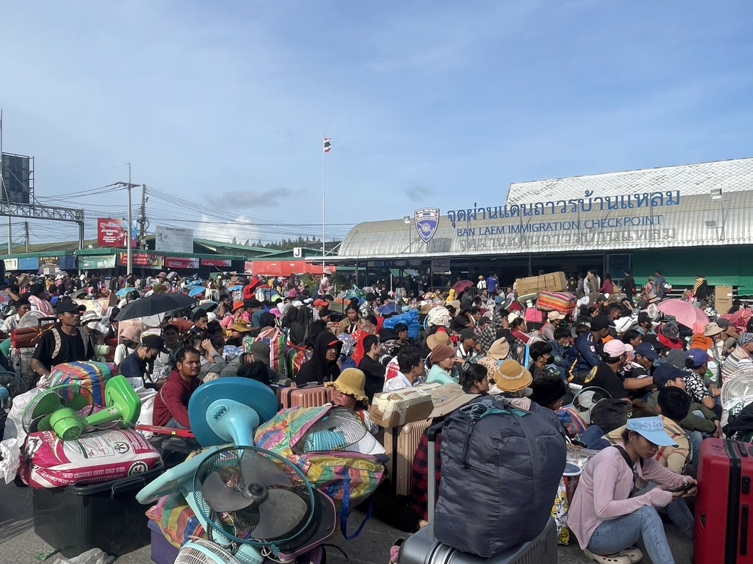/ ที่จุดผ่านแดนด้านจังหวัดจันทบุรี ทั้งจุดบ้านแหลม และจุดผ่านแดนถาวรบ้านผักกาด อำเภอโป่งน้ำร้อน ในวันนี้ ได้มีแรงงานชาวกัมพูชาจำนวนมากที่มาจากที่ทำงานในหลายพื้นที่ของประเทศไทยมารอข้ามด่านเพื่อกลับประเทศคาดว่าทั้ง2ด่าน จะมีแรงงานกลับประเทศกัมพูชากว่า2หมื่นคนในวันนี้ โดยมีในส่วนของเจ้าหน้าที่ของฝั่งไทยช่วยจัดระเบียบในการข้ามฝั่งด้วยความรวดเร็วเพื่อไม่ให้เหลือแรงงานตกค้างก่อนปิดด่านในเวลา15.00น. ในการจัดระเบียบนั้นเจ้าหน้าที่ก็จะทำการคัดกรอง ผู้ป่วย คนท้อง เด็กอ่อน และผู้พิการ จะคัดออกมาเพื่อให้สิทธิข้ามแดนไปก่อน จากนั้นก็จะเป็นแรงงานทั่วไปที่มี สัมภาระพอแบกไปได้ข้ามตามไป และสุดท้ายก็จะเป็นแรงงานที่สัมภาระเยอะ ต้องใช้รถเข็น จะข้ามชุดสุดท้าย จากการลงพื้นที่ของผู้สื่อข่าว จะสังเกตได้ว่าการกลับประเทศของแรงงานในระลอกนี่จะเยอะกว่าทุกครั้งที่ผ่านมา จากคนที่ไม่อยากกลับประเทศ แต่ในวันนี้ต้องเปลี่ยนใจทันทีและยืนยันจะต้องกลับประเทศ จากปัจจัยหลายอย่างที่จำเป็นต้องกลับ จากการสอบถามทั้งนายจ้างและแรงงานจึงได้ทราบว่า ที่แรงงานกลับประเทศในระลอกนี้เพราะมีความกดดันในหลายด้านจากทางฝั่งประเทศกัมพูชา จนเป็นกระแสรวมตัวกลับประเทศ ในส่วนของแรงงานที่กลับประเทศในครั้งนี้บอกว่า ถูกทางพ่อ-แม่ โทรมาอ้อนวอนให้กลับ เพราะมีกระแสว่าถ้าไม่กลับจะถูกตัดสิทธิต่างๆเช่นเรื่องที่ดินทำกิน เรื่องนโยบายของรัฐบาลที่จะช่วยเหลือในด้านต่างๆก็จะถูกตัดสิทธิ์ และแรงงานบางรายก็อยู่ติดหมู่บ้านชายแดนมี่ความเป็นห่วงครอบครัวซึ่งอยู่ในช่วงเหตุการณ์จึงขอกลับไปดูแลครอบครัวก่อน ในส่วนของกลุ่มผู้ใช้แรงงานของโรงงานต่างๆในประเทศไทยทราบจากแรงงานว่า ได้สมัครงานโรงงานทางฝั่งกัมพูชาไว้แล้วก็จะกลับไปทำงานยังประเทศของตน ถึงค่าแรงจะถูกกว่าประเทศไทย แต่ก็มีความสะดวกกว่า /ภาพข่าว ชูชาติ โพธิ์ทอง จันทบุรี/