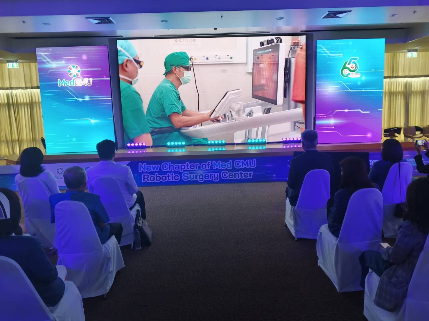 รศ.นพ.นเรนทร์ โชติรสนิรมิตคณบดีคณะแพทยศาสตร์ ศ.เชี่ยวชาญพิเศษ นพ.บรรณกิจ โลจนภิวัฒน์ ที่ปรึกษาคณะแพทยศาสตร์ ผศ.ดร.อัคร อมันตกูล หน่วยศัลยกรรมระบบทางเดินปัสสาวะ รศ.นพ.วรกิตติ ลาภพิเศษพันธุ์ หน่วยศัลยกรรมทางเดินน้ำดีและตับอ่อน ภญ.สุชาดา ธนาวิบูลเศรษฐ ผู้อำนวยการอาวุโสบริษัทเมคโทรนิค (ประเทศไทย) จำกัด Mr.Feng Dong Vice President,Medtronic Asia RLM แถลงข่าวเปิดตัวนวัตกรรมหุ่นยนต์ช่วยผ่าตัด ระบบใหม่ HUGORAS “New Chapter of Med CMU Robotic Surgery Center” แห่งแรกของประเทศไทยและภูมิภาคเอเซียตะวันออกเฉียงใต้ เพื่อยกระดับระบบบริการสุขภาพด้วยเทคโนโลยีชั้นสูง และยกระดับความเป็นเลิศในการดูแลผู้ป่วย ให้เป็นศูนย์กลางด้วยเทคโนโลยี่และนวัตกรรม