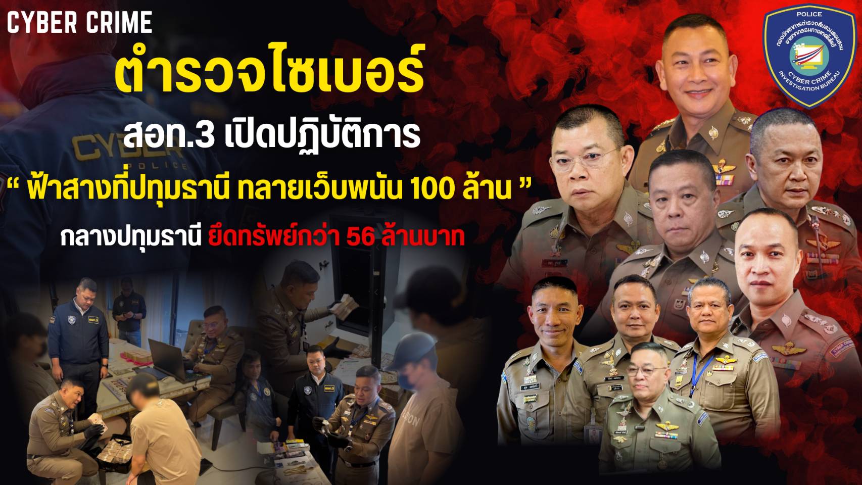 วันพุธที่ 6 ส.ค.68 ที่ บริเวณชั้น 1 บก.สอท.2 (เมืองทองธานี) นำโดย พล.ต.ท.ไตรรงค์ ผิวพรรณ ผบช.สอท., พล.ต.ต.อรรถสิทธิ์ สุดสงวน รอง ผบช.สอท., พล.ต.ต.วิวัฒน์ คำชำนาญ รอง ผบช.สอท., พล.ต.ต.ทินกร รังมาตย์ รอง ผบช.สอท. พล.ต.ต.ศิริวัฒน์ ดีพอ ผบก.สอท.1, พล.ต.ต.ศรายุทธ จุณณวัตต์ ผบก.สอท.2 และ พล.ต.ต.ชัชปัณฑกาณฑ์ คล้ายคลึง ผบก.สอท.3 พร้อมเจ้าหน้าที่ที่เกี่ยวข้องร่วมแถลงข่าว ตำรวจไซเบอร์ทลายเว็บพนัน 100 ล้านกลางปทุมธานี รวบผู้รับผลประโยชน์ พร้อมยึดทรัพย์กว่า 56 ล้าน