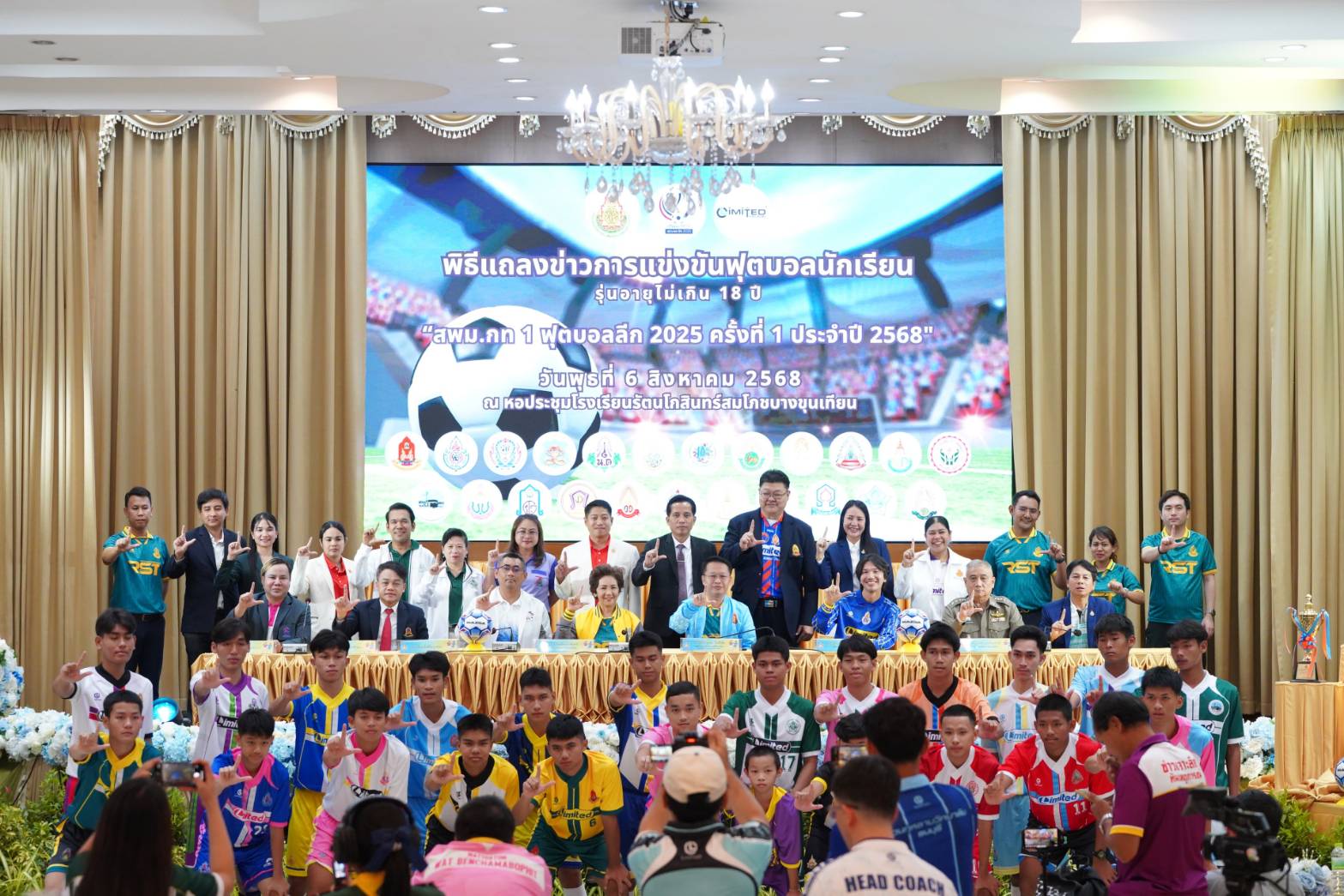 เมื่อเวลา 13.30 น.วันที่ 6 ส.ค.ที่หอประชุมโรงเรียนรัตนโกสินทร์สมโภช บางขุนเทียน กทม. นายศรายุทธ ธิศรีชัย รองผู้อำนวยการ สำนักงานเขตพื้นที่การศึกษา มัธยมศึกษากรุงเทพมหานคร เขต 1 เป็นประธานในพิธีแถลงข่าวการแข่งขันฟุตบอลนักเรียน รุ่นอายุไม่เกิน 18 ปี “สพม.กท.1 ฟุตบอลลีก 2025 ครั้งที่ 1 ประจำปี 2568” โดยมี นายวิธวินท์ กิตติโศภณศักดิ์ ประธานบริษัท Limited Thailand พร้อมด้วยนางมนัสดากาณฑ์ รักษ์พงศ์สถิต ผู้อำนวยการโรงเรียนรัตนโกสินทร์สมโภชบางขุนเทียน, พ.ต.อ.ฉัฐกิตติ์ ผดุงจันทน์ธนัย ผกก.สน.บุคคโล นายเศวตฉัตร บุญภิละ รองผู้อำนวยการโรงเรียนโยธินบูรณะ, นายราชันต์ ทิพยโสต ผู้อำนวยการโรงเรียนศึกษานารีวิทยา และนายศิวาวุฒิ รัตนะ รองผู้อำนวยการโรงเรียนโพธิสารพิทยากร และคณะตัวแทนนักเรียนที่เข้าร่วมการแข่งขัน รวม 23 โรงเรียน