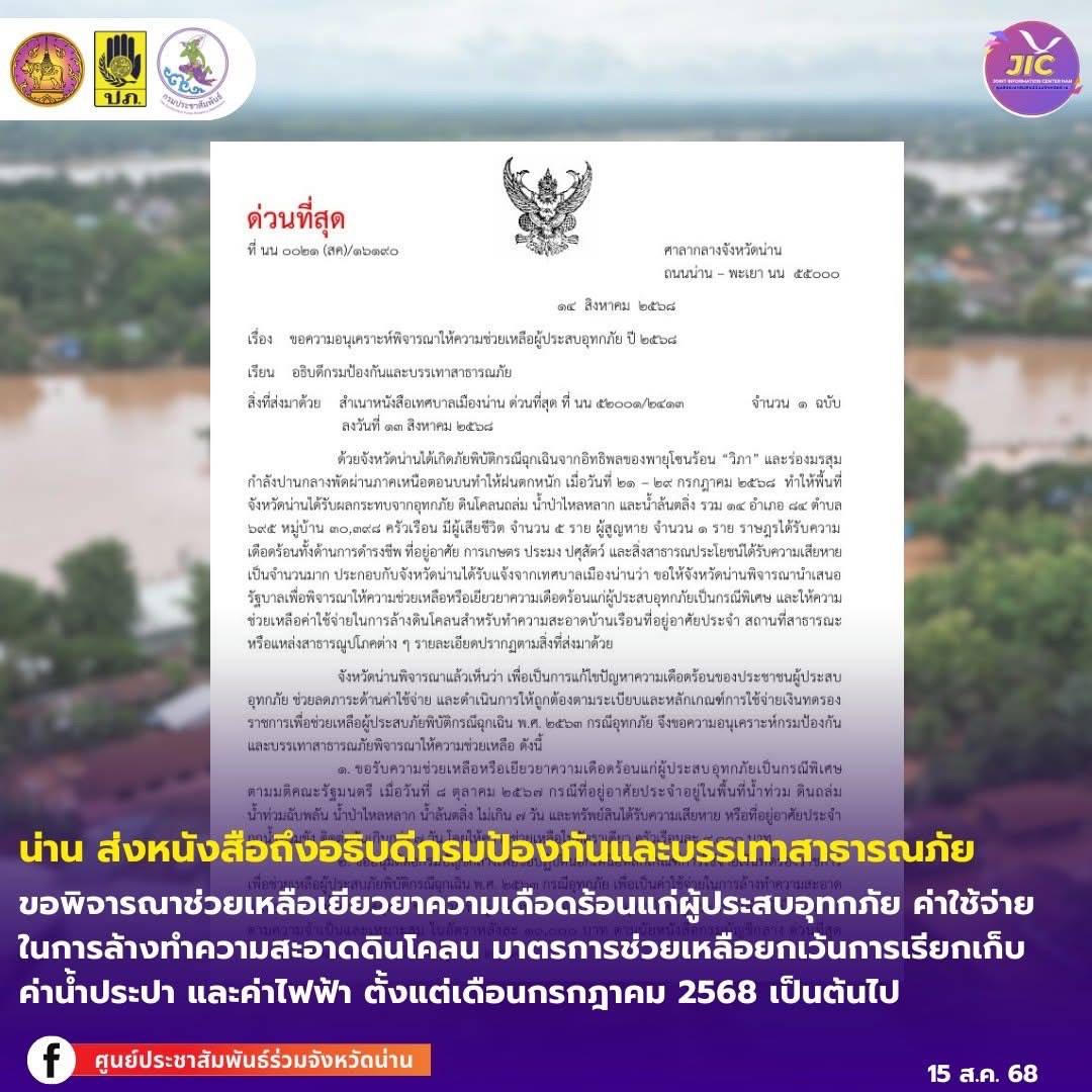 จังหวัดน่านทำหนังสือถึงอธิบดีกรมป้องกันและบรรเทาสาธารณภัย ขอพิจารณาช่วยเหลือประชาชนที่อยู่อาศัยในพื้นที่น้ำท่วม ดินถล่ม น้ำท่วมฉับพลัน น้ำป่าไหลหลาก และน้ำล้นตลิ่ง ไม่เกิน 7 วัน เพื่อให้ได้รับการเยียวยาอย่างเท่าเทียมและเสมอภาค