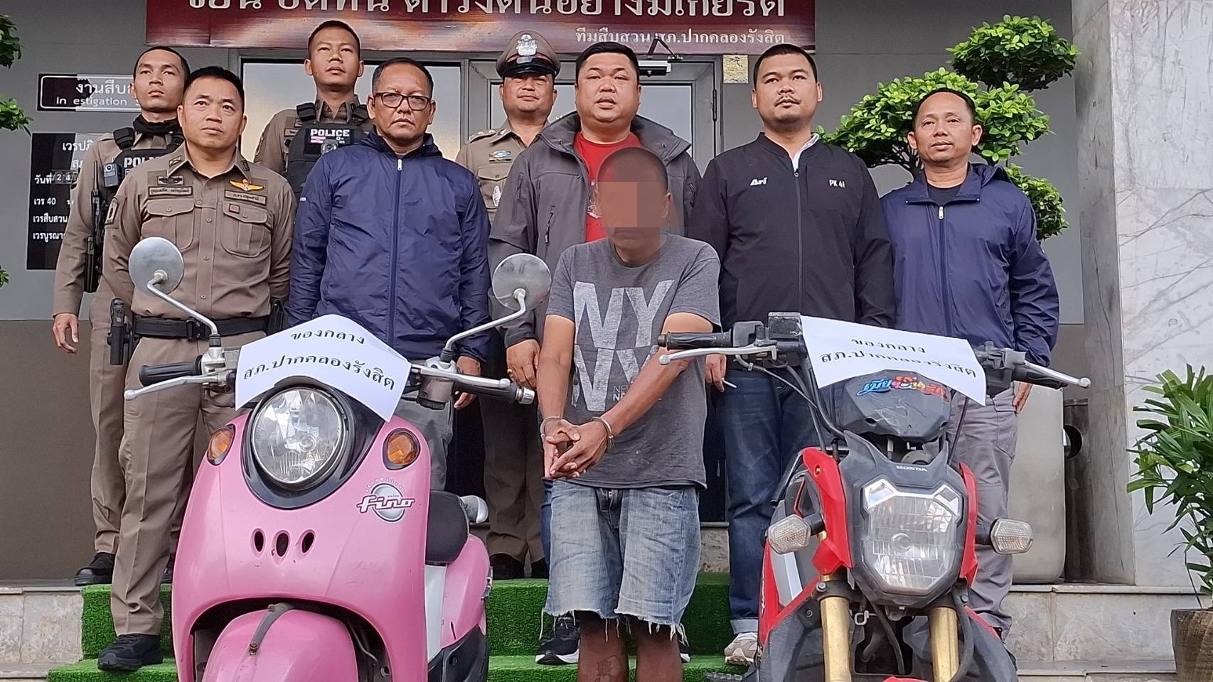 พ.ต.ท.สิรภพ บัวหลวง รอง ผกก.(สส.)ฯ กล่าวว่า สืบเนื่องมาจาก เมื่อวันที่ 23 ส.ค. 68 เวลา 23.00 น. เจ้าหน้าที่สายตรวจ สภ.ปากคลองรังสิต ได้พบเห็นนายชัยวุฒิ หรือ”นายแบงค์” ขับขี่รถ จยย.ยามาฮ่า สีชมพู ผ่านมาท่าทางมีพิรุธ บริเวณริมถนนรังสิต-ปทุมธานี ม.6 ต.บางพูน อ.เมือง จ.ปทุมธานี จึงได้ขับติดตาม แล้วเรียกเพื่อตรวจสอบ เบื้องต้นจากการตรวจสอบครั้งแรกพบยาบ้าอยู่ในตัวจำนวน 2 เม็ด จึงควบคุมตัวมาที่โรงพัก พร้อมกับส่งมอบให้ทางเจ้าหน้าที่ชุดสืบสวนตรวจสอบประวัติและขยายผล ซึ่งจากการตรวจสอบยังพบอีกว่ารถ จยย.คันดังกล่าวนั้น นายแบงค์เพิ่งจะไปก่อเหตุลักมา จึงได้ประสานไปยังเจ้าของรถโดย้จ้าของรถยังพึ่งมารู้ว่ารถถูกขโมย ก่อนเข้าแจ้งความกับเจ้าหน้าที่ตำรวจทันที
