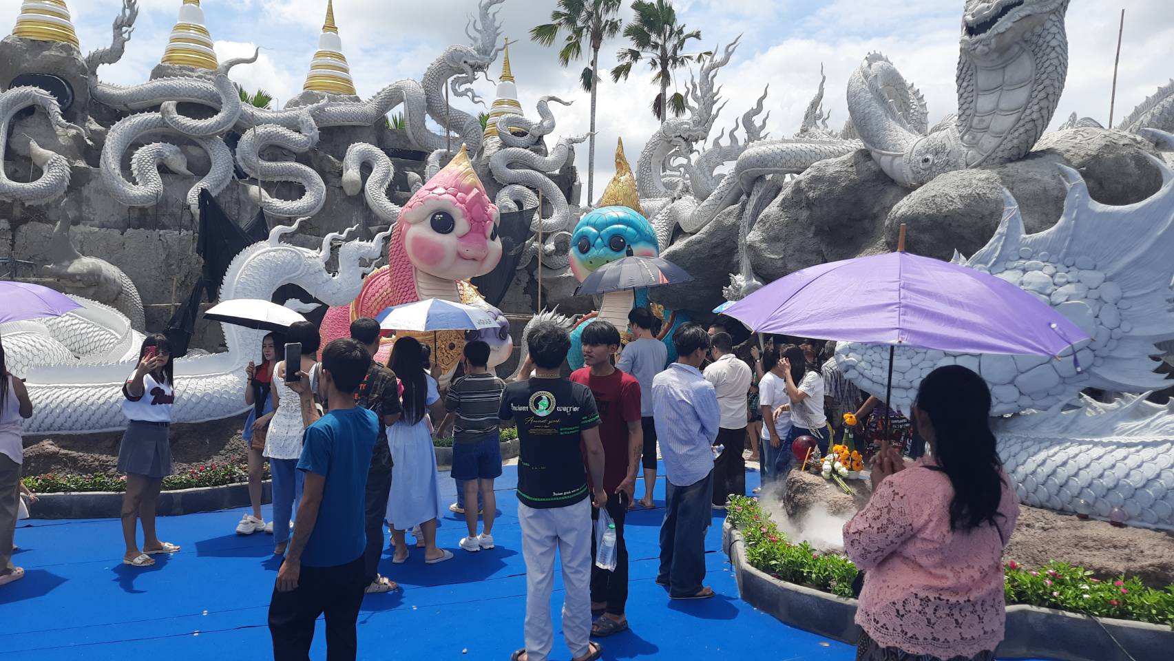 ผู้สื่อข่าวรายงานว่าที่ อุทยานธรรมพญานาคราชพระปางเปิดโลก วัดดอนใหญ่ ต.ลำลูกกา อ.ลำลูกกา จ.ปทุมธานี ได้มีประชาชนจำนวนมากแห่เดินทางมาเข้าเยี่ยมชมความสวยงานภายในอุทยานธรรมพญานาคราชพระปางเปิดโลก ที่มีสะพานทอดยาวที่ประดับตกแต่งด้วยพญานาครูปบ่วงตลอดเส้นทางสวยงามเป็นอย่างมาก โดยเฉพาะพญานาคน้อยทั้ง 3 ตนเป็นกระแสในโซเชียลที่มีการทาสีอย่างสวยงามทั้ง 3 ตนจนนักท่องเที่ยวต่างเข้าแถวถ่ายรูปเป็นที่ระลึกจำนวนมาก ท่ามกลางอากาศที่ร้อนอบอ้าวก็สู้แดดมาถ่ายรูปคู่กับพญานาคกันอย่างไม่หวั่นไหว