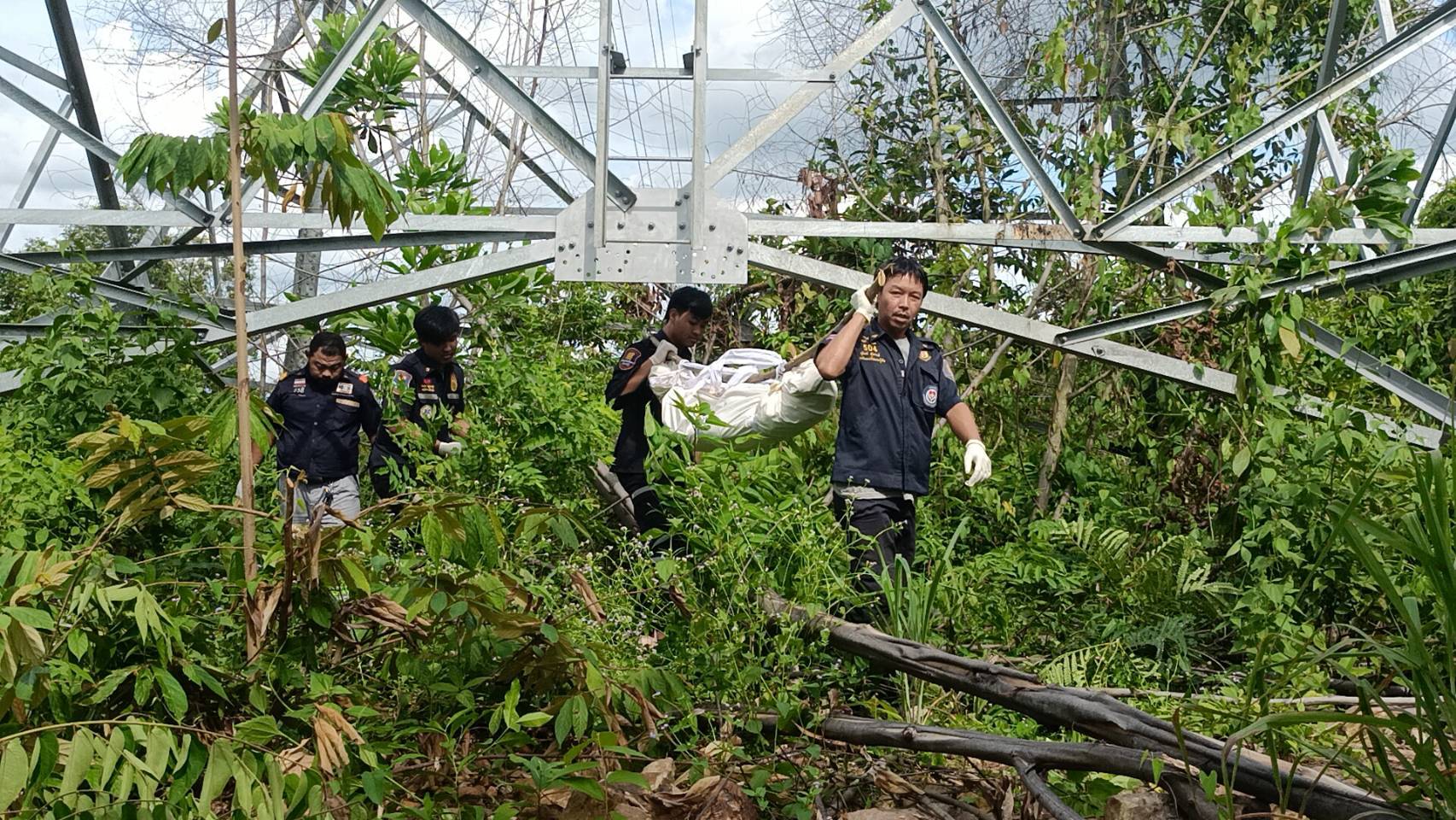 จากนั้นร่วมกับแพทย์เวรโรงพยาบาลกบินทร์บุรีและอาสาสมัครหน่วยกู้ภัยฯเดินเท้าขึ้นไปบนเนินเขาเหนือหมู่บ้านระยะทางประมาณ 800 เมตร เบื้องต้นพบร่างผู้เสียชีวิตเป็นเพศชายเหลือแต่หนังหุ้มกระดูก ใช้เถาวัลย์ขนาดเท่านิ้วมือผูกคอตัวเองติดกับเหล็กราวโครงเสาไฟฟ้าแรงสูงขนาดใหญ่ บริเวณไหล่ด้านซ้ายเขียนคำว่าเอ๋รักแอน ใต้ข้อเท้าพบกางเกงในสีแดงติดค้างอยู่ และบริเวณที่เกิดเหตุพบขวดน้ำและรองเท้าของผู้เสียชีวิตรวมอยู่ด้วย ไม่พบหลักฐานเอกสารยืนยันตัวตน