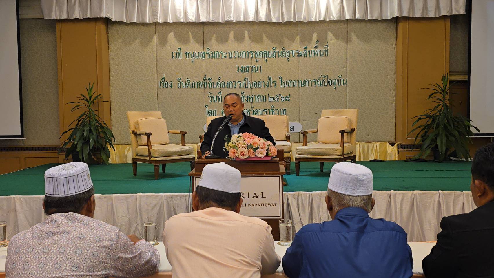 วันที่ 25 สิงหาคม 2568 ที่ห้องนราทัศน์ โรงแรมอิมพีเรียล อ.เมือง จ.นราธิวาส คณะขับเคลื่อนการพูดคุยสันติสุขระดับพื้นที่ (คพท.) เปิด เวทีสาธารณะแลกเปลี่ยนเรียนรู้ในกระบวนการพูดคุยเพื่อสร้างสันติสุขในพื้นที่ให้กับสมาชิกของ คพท.จังหวัดนราธิวาส เพื่อหนุนเสริมกระบวนการพูดคุยสันติสุขระดับพื้นที่ ได้พบปะแลกเปลี่ยนความคิดเห็น เสนอแนะแนวทางในการขับเคลื่อนการสร้างสภาวะแวดล้อมในพื้นที่ให้สอดคล้องกับสถานการณ์ในปัจจุบัน พร้อมร่วมกันทบทวนปัญหาข้อขัดข้องปรับแผนการปฏิบัติงาน พร้อมรับทราบความคืบหน้าแนวทางนโยบายและแผนงานการขับเคลื่อนกระบวนการพูดคุยสันติสุขจังหวัดชายแดนภาคใต้ ตามแนวทางของรัฐบาลในการแก้ไขปัญหาจังหวัดชายแดนภาคใต้ โดยมีพลตรีเฉลิมชัย สุทธินวล ผู้อำนวยการศูนย์สันติวิธี เป็นประธานการเสวนา พร้อมด้วย ดร.ดุลยรัตน์ บูยูโซ๊ะ ประธานคณะกรรมการ คพท. พันโท ปรีชา รุ่งเมือง หัวหน้าสำนักงานขับเคลื่อนการพูดคุยสันติสุขระดับพื้นที่ และผู้แทนคณะขับเคลื่อนการพูดคุยสันติสุขระดับพื้นที่ (คพท.) จากนราธิวาส ร่วมเสวนาพูดคุย