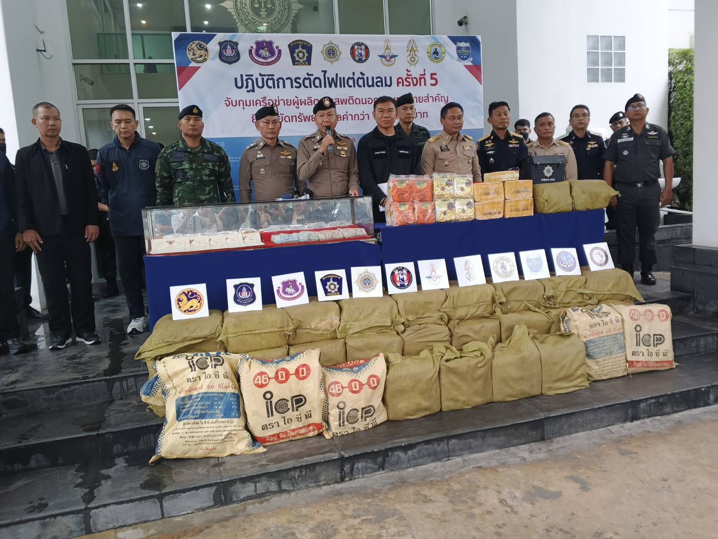 วันที่ 26 สิงหาคม 2568 ที่สำนักงาน ป.ป.ส.ภาค.5 อ.เมือง จ.เชียงใหม่ พล.ต.ท.ภาณุรัตน์ หลักบุญ เลขาธิการ ป.ป.ส. เป็นประธานแถลงผลปฏิบัติการ “ตัดไฟต้นลมครั้งที่ 5” เพื่อทำลายเครือข่ายผู้ผลิตยาเสพติดนอกประเทศ และบังคับใช้กฏหมายอย่างจริงจังต่อผู้ค้า ผู้ลำเลียงในพื้นที่ชายแดนและตอนใน พร้อมติดตามยึดทรัพย์รวมกว่า 27 ล้านบาท มีพล.ท.กิตติพงศ์ ชื่นใจชน ผู้บัญชาการ นบ.ยส. 35 พล.ต.ท.กฤตธาพล ยี่สาคร ผบช.ภ. 5 พล.ต.ต.ยุทธนา แก่นจันทร์ ผบก ภ.จว.เชียงใหม่ นายรุจติศักดิ์ รังษี รองผู้ว่าราชการจังหวัดเชียงราย นายชัยณรงค์ นันตาสาย ปลัดจังหวัดเชียงใหม่ นายสมชาย ติไชย ผู้อำนวยการศูนย์ปฏิบัติการคดีพิเศษเขตพื้นที่ 5 นายธันวา ผุดผ่อง ผู้อำนวยการ ป.ป.ส.ภาค5 พร้อมหัวหน้าส่วนราชการเข้าร่วมแถลงข่าวดังกล่าว
