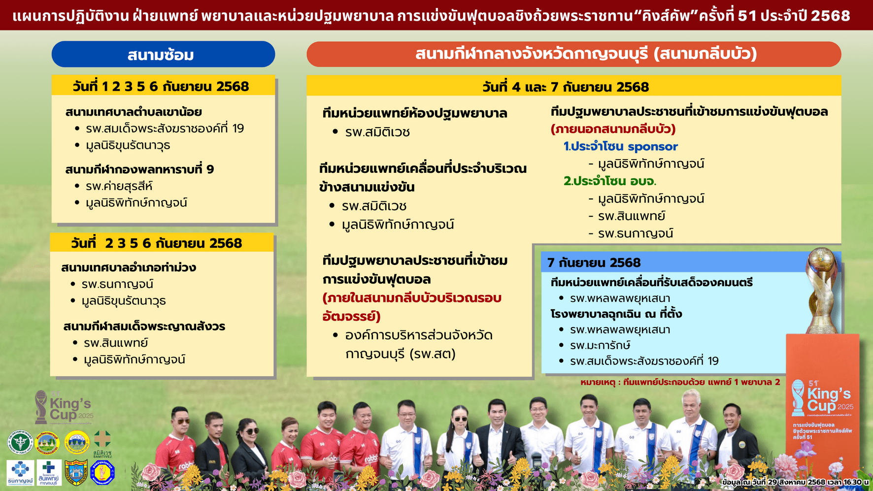 สำหรับโปรแกรมฟุตบอลชิงถ้วยพระราชทานคิงส์คัพ ครั้งที่ 51 วันพฤหัสบดีที่ 4 ส.ค.68 เวลา 16.00 น.ทีมชาติ อิรัก พบ ทีมชาติฮ่องกง เวลา 20.00 น.ทีมชาติไทย พบ ทีมชาติฟิจิ ที่สนามกีฬากลางจังหวัดกาญจนบุรี (กลีบบัว) ทีมชนะจะผ่านเข้าสู่รอบชิงชนะเลิศ ในวันที่ 7 ก.ย.เวลา 20.00 น.ส่วนทีมแพ้เข้าชิงอันดับ 3 เวลา 16.00 น.ของวันเดียวกัน แฟนฟุตบอลที่ไม่สามารถเดินทางมาดูที่สนามได้ สามารถติดตามชมการถ่ายทอดสดได้ทาง TrueVisions NOW, ไทยรัฐ ทีวี และ BG Sports มาลุ้นกันว่าทีมชาติไทยจะสามารถป้องกันแชมป์การแข่งขันฟุตบอลชิงถ้วยพระราชทานคิงส์คัพ ครั้งที่ 51 ที่สนามกีฬากลางจังหวัดกาญจนบุรี (กลีบบัว)เอาไว้ได้หรือไม่ ต้องมาเชียร์ไปพร้อมๆกัน