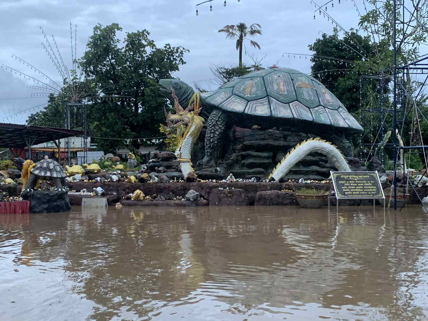 พายุฝนตกทั้งคืน ทำให้ลำน้ำพุงล้นไหลบ่าเข้าท่วมลานพญาเต่างอย ส่อเค้างานไหลเรือไฟ 1-7 กันยายน ล่ม พ่อค้าแม่ค้าเก็บของหนีน้ำ ขณะที่ยังมีคนเดินทางมาสักการะไม่ขาด