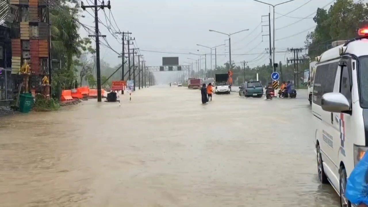 เมื่อวันที่ 4 ก.ย.68 ผู้สื่อข่าวรายงานว่าที่บริเวณหนองมูลตะกั่ว ม.5 ต.คึกคัก อ.ตะกั่วป่า จ.พังงา เจ้าหน้าที่กรมทางหลวง เร่งติดตั้งป้าย พร้อมสัญญาณเตือน หลังเกิดฝนตกหนักอย่างต่อเนื่อง จนน้ำท่วมขังผิวจราจรถนนเพชรเกษมสายตะกั่วป่า-ท้ายเหมือง ต.คึกคัก อ.ตะกั่วป่า จ.พังงา สูง 20-40 เซนติเมตร ทำให้รถเล็กต้องขับลุยน้ำผ่านไปอย่างช้าๆ ขณะที่ เทศบาลตำบลคึกคัก เจ้าหน้าที่กู้ภัยต้องออกอำนวยความสะดวกด้านการจราจรซึ่งขณะนี้ในพื้นที่ยังคงมีฝนตกหนักต่อเนื่องและถ้าน้ำทะเลไม่หนุนหรือฝนไม่ตกลงมาเพิ่มคาดว่าต้องใช้เวลาประมาณ 1-2 ชั่วโมงจะสามารถระบายน้ำลงสู่ทะเลกลับสู่สภาวะปกติได้โดยเร็ว