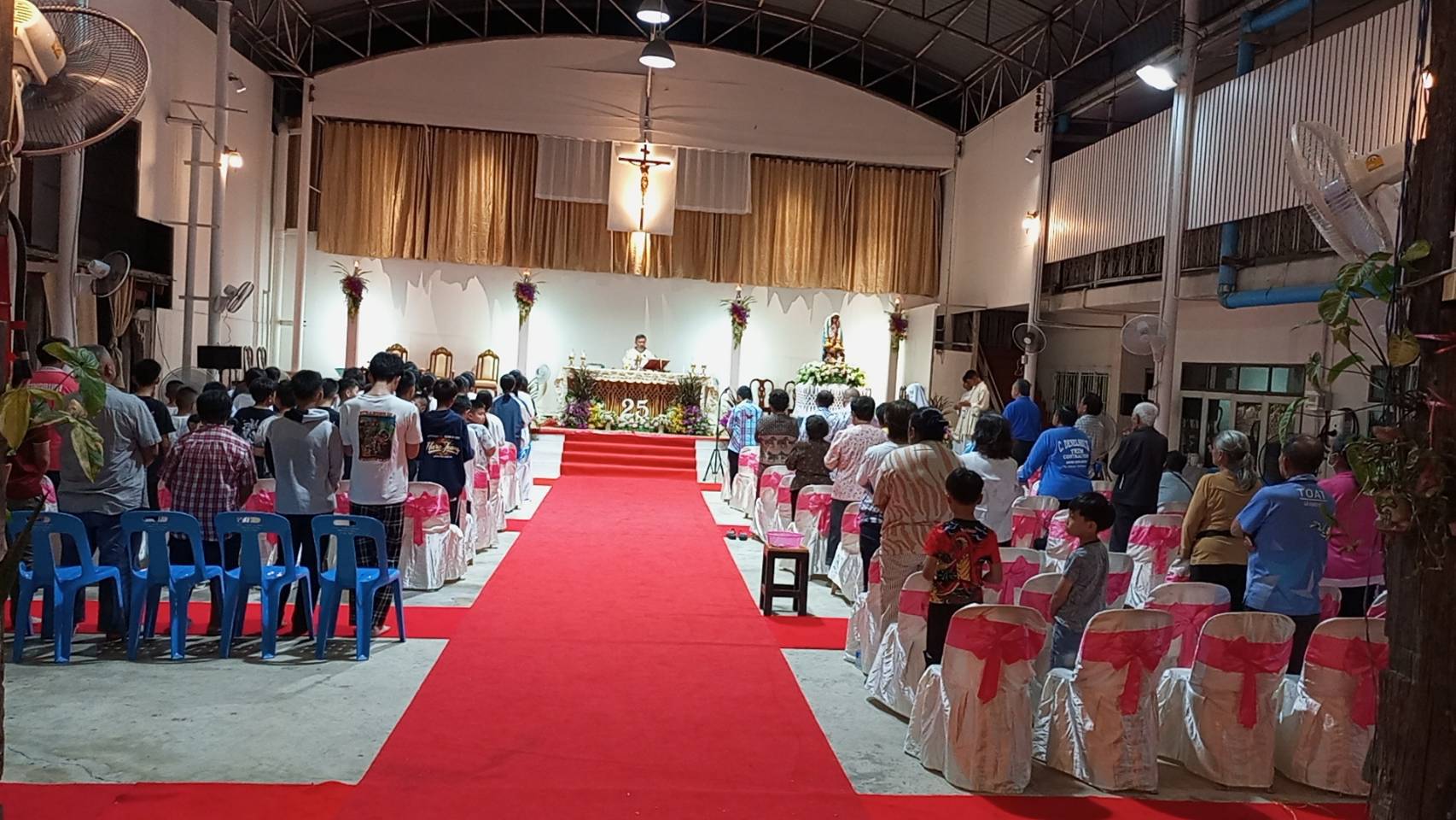 วันที่ 5 กันยายน 2568 เวลา 19.00 น. วัดพระแม่มารีอา มารดาคริสตชน อำเภอเมืองสิงห์บุรี จังหวัดสิงห์บุรี จัดพิธีบูชาขอบพระคุณ โอกาสเตรียมจิตใจก่อนถึงวันฉลองวัด โดยมี บาทหลวงดอมินิก สุรเดช กิจเจริญ เจ้าอาวาสวัดพระหฤทัย สวรรคโลก จังหวัดสุโขทัย เป็นประธานในพิธี