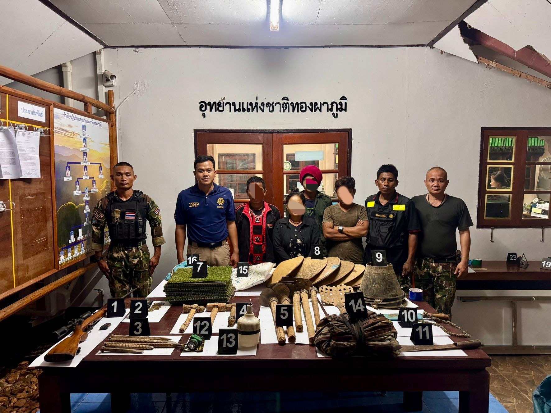 ซึ่งศาลจังหวัดทองผาภูมิ พิพากษา จำคุกจำเลยทั้ง 5 คนละ 7 ปี 4 เดือน โดยไม่รอลงอาญา แต่จำเลยทั้งห้าให้การยอมรับสารภาพ เป็นประโยชน์แก่การพิจารณาของศาล จึงมีเหตุบรรเทาโทษ ลดโทษให้กึ่งหนึ่ง คงเหลือจำคุก คนละ 3 ปี 8 เดือน และให้จำเลยทั้ง 5 ร่วมกันชดใช้ค่าเสียหายให้แก่กรมอุทยานแห่งชาติ สัตว์ป่า และพันธุ์พืช เป็นเงิน จำนวน 12,800 บาท พร้อมดอกเบี้ยอัตราร้อยละ 5 ต่อปี นับแต่วันที่ 28 มีนาคม 2568 เป็นต้นไป จนกว่าจะชำระเสร็จ ส่วนของกลาง 17 รายการ ให้ริบเป็นของแผ่นดิน