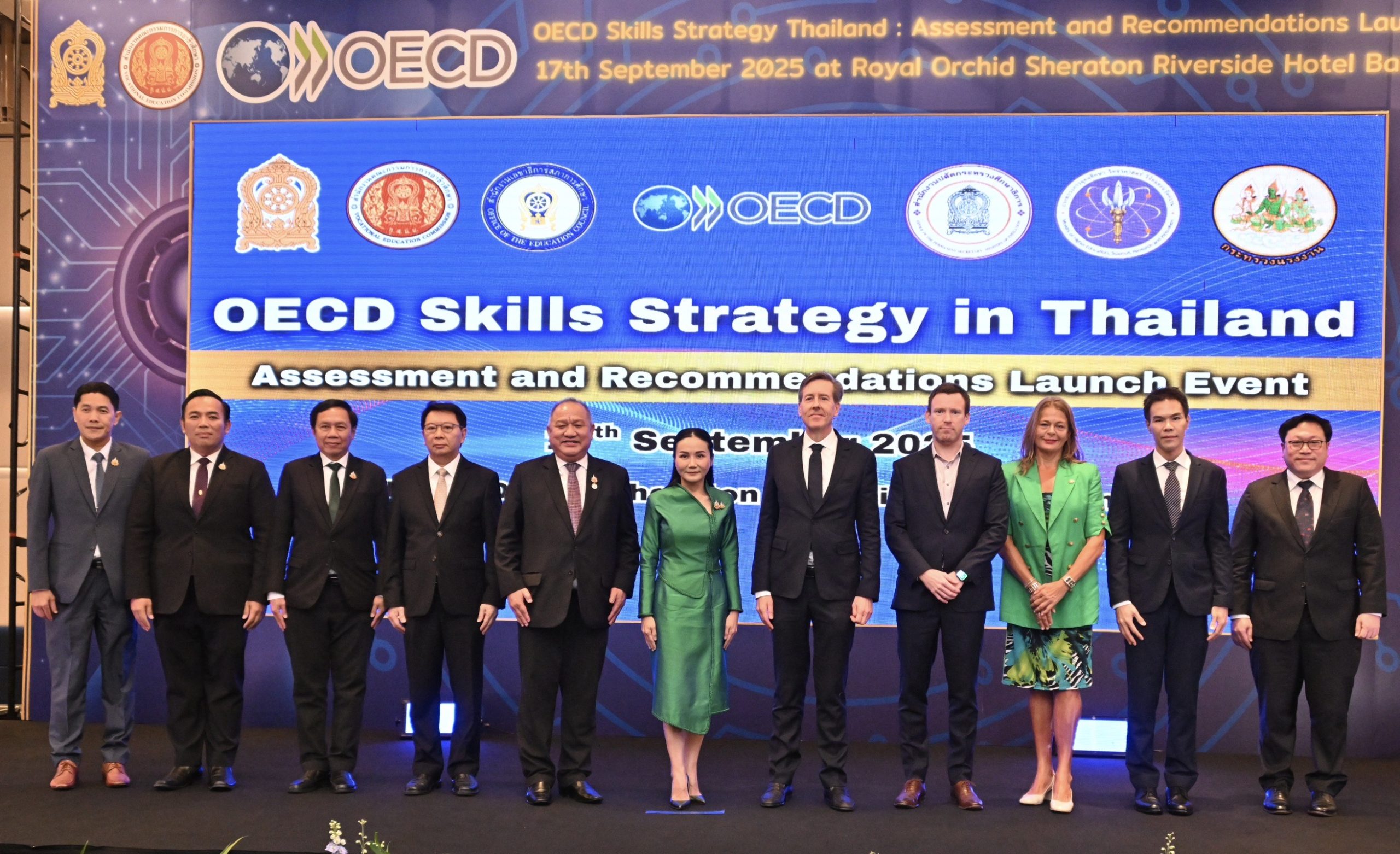 วันที่ 17 กันยายน 2568 ศาสตราจารย์ ดร.นฤมล ภิณโญสินวัฒน์ รัฐมนตรีว่าการกระทรวงศึกษาธิการ (รมว.ศธ.) เป็นประธานเปิดตัวรายงานโครงการ Developing Skills Strategy in Thailand – Country Programme ระยะที่ 2 ระหว่างรัฐบาลไทย กับ The Organization for Economic Co-operation and Development (OECD) โดยย้ำถึงความมุ่งมั่นของรัฐบาลในการพัฒนาทรัพยากรมนุษย์ให้พร้อมรับมือกับการเปลี่ยนแปลงของโลก และขับเคลื่อนประเทศสู่โมเดลเศรษฐกิจใหม่ พร้อมด้วยผู้แทนจาก OECD สถานเอกอัครราชทูตฟินแลนด์ หอการค้าอังกฤษ เยอรมัน-ไทย ไอร์แลนด์ ผู้แทนสำนักงานปลัดกระทรวงศึกษาธิการ สำนักงานเลขาธิการสภาการศึกษา กรมพัฒนาฝีมือแรงงาน กระทรวงแรงงาน สำนักงานปลัดกระทรวงการอุดมศึกษา วิทยาศาสตร์ วิจัย และนวัตกรรม หน่วยงานกระทรวงที่เกี่ยวข้อง และผู้ทรงคุณวุฒิ เข้าร่วมงาน ในการนี้ นายยศพล เวณุโกเศศ เลขาธิการคณะกรรมการการอาชีวศึกษา กล่าวรายงาน ณ โรงแรมรอยัล ออคิด เชอราตัน ริเวอร์ไซด์ กรุงเทพมหานคร