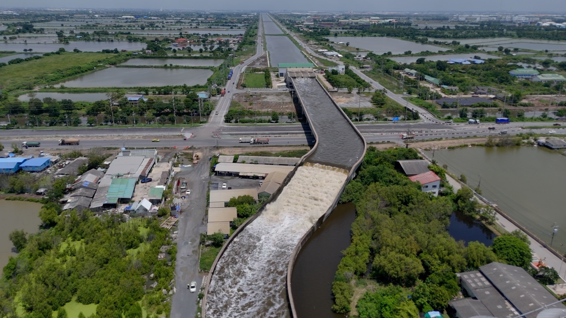 ขณะที่ ทีมข่าวเราลงพื้นที่สำรวจการสูบน้ำจากลำคลองสายหลัก อย่างเช่นคลองส่งน้ำสุวรรณภูมิ “สะพานน้ำยกระดับ” แห่งเดียวในไทย โครงการพระราชดำริ ร.9 ช่วยพสกนิกรพ้นวิกฤตน้ำท่วมการป้องกันแก้ไขปัญหาน้ำท่วมพื้นที่โดยรอบสนามบินสุวรรณภูมิ กับโครงการระบายน้ำบริเวณสนามบินสุวรรณภูมิ ที่ผ่านมาเป็นไปอย่างมีประสิทธิภาพ ผ่าน สะพานคลองส่งน้ำสุวรรณภูมิ สะพานน้ำยกระดับแห่งเดียวในประเทศไทย ซึ่งทำหน้าที่นำน้ำจากคลองลงสู่ทะเลโดยตรง หนึ่งในโครงการพระราชดำริของ พระบาทสมเด็จพระบรมชนกาธิเบศร มหาภูมิพลอดุลยเดชมหาราช บรมนาถบพิตร ในหลวงรัชกาลที่ 9 โดย สะพานคลองส่งน้ำสุวรรณภูมิ เป็นสะพานน้ำยกระดับ ที่มีความยาวมากที่สุดแห่งแรกของประเทศไทย ถูกสร้างขึ้นจากแนวพระราชดำริ ของ พระบาทสมเด็จพระบรมชนกาธิเบศร มหาภูมิพลอดุลยเดชมหาราช บรมนาถบพิตร เมื่อปี 2546 ที่พระราชทานให้กับหน่วยงานที่เกี่ยวข้อง แก้ไขปัญหาพื้นที่ลุ่มน้ำเจ้าพระยาฝั่งตะวันออกตอนล่าง ซึ่งเป็นพื้นที่ลุ่มต่ำ บางแห่งเป็นพื้นที่แอ่งท้องกระทะ และการขยายตัวของเมือง ทำให้พื้นที่รับน้ำลดลง และการระบายน้ำออกสู่อ่าวไทยทำได้ยากขึ้นรัฐบาลจึงได้จัดตั้ง โครงการระบายน้ำบริเวณสนามบินสุวรรณภูมิขึ้น และเริ่มลงมือก่อสร้าง สะพานน้ำยกระดับตั้งแต่ปี 2548 แล้วเสร็จเปิดใช้อย่างเป็นทางการ เมื่อปี 2553 สะพานน้ำยกระดับ มีความยาวกว่า 10 กิโลเมตร มีลักษณะคล้ายคลองระบายน้ำ ที่ถูกสร้างเป็นสะพานน้ำยกสูงจากถนนสุขุมวิทถึง 6 เมตร เป็นรูปตัวยู ข้ามคลองชายทะเล และถนนสุขุมวิท ประสิทธิภาพของการใช้งาน ช่วยระบายน้ำต่อจากคลองสำโรงได้สูงสุด 100 ลูกบาศก์เมตรต่อวินาที โดยมีเครื่องสูบระบายน้ำ 4 เครื่อง ผลักดันออกทะเล ซึ่งในช่วงมหาอุทกภัย น้ำท่วมใหญ่ปี 2554 โครงการนี้ถือว่าเป็นจุดหลักที่ช่วยระบายน้ำ ได้มากถึง 560 ล้านลูกบาศก์เมตร หรือเทียบเท่ากว่าครึ่งหนึ่งของเขื่อนป่าสักชลสิทธิ์ ส่งผลให้พื้นที่จังหวัดสมุทรปราการ แทบไม่ได้รับผลกระทบเลย เนื่องจากมีคลองระบายน้ำสุวรรณภูมิ ช่วยในการระบายน้ำ