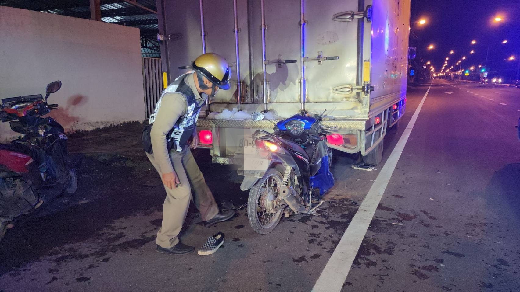 ด้าน นายพร (นามสมมุติสงวนนามสกุล) อายุ 35 ปี ชาว อ.พิปูน จ.นครศรีธรรมราช คนขับรถบรรทุก ให้การว่า ได้จอดรถชิดไหล่ทางหน้าโรงน้ำแข็งเพื่อตรวจสอบความเรียบร้อย ก่อนจะออกเดินทาง แต่จู่ ๆ ได้ยินเสียงดังท้ายรถ เมื่อลงไปตรวจสอบพบว่ามีรถจักรยานยนต์พุ่งชนเข้ามาอย่างแรง