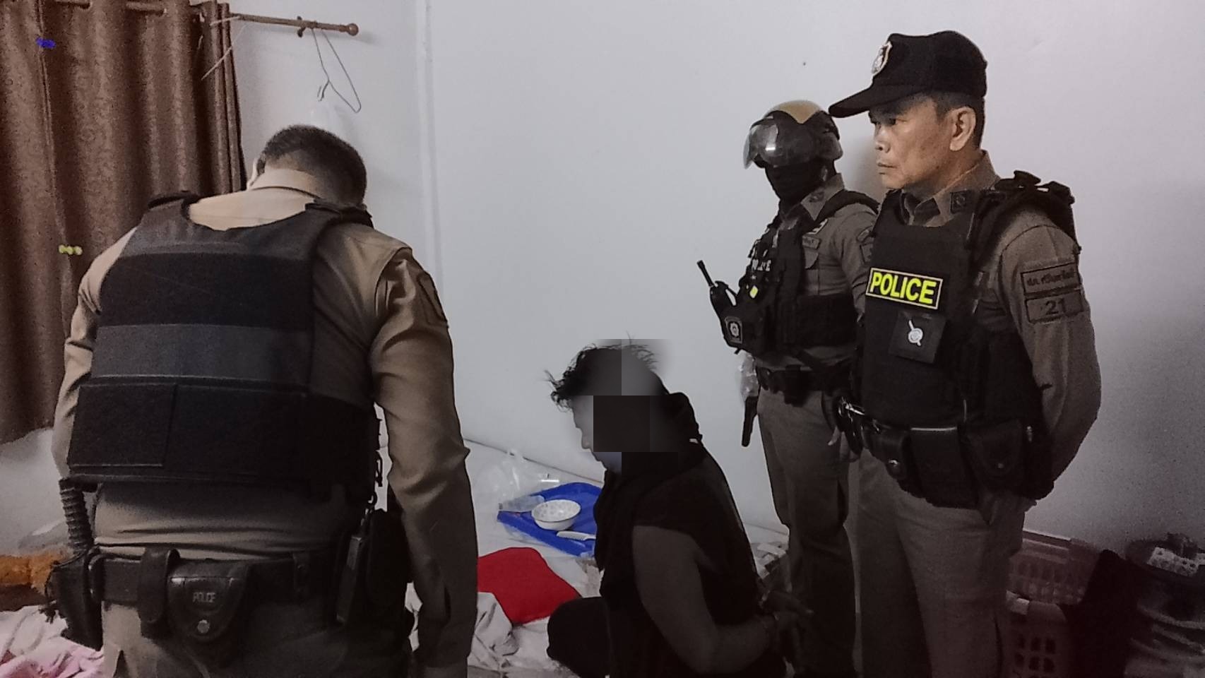 ตำรวจ จึงแจ้งให้ผู้ก่อเหตุออกมาด้านนอก เพื่อแสดงความบริสุทธิ์ใจ แล้วก็เดินออกมา ทางเจ้าหน้าที่ตำรวจ ได้นำกำลังควบคุมและได้ทำการล็อคกุญแจมือ ก่อนนำตัวเข้าไปค้นอาวุธปืนภายในบ้าน พบอาวุธปืน บีบีกัน อยู่ใต้ที่นอน จำนวน 1 กระบอก โดยยอมรับว่าเป็นปืนของตนเองที่พกติดตัวมา เพื่อใช้ขู่ลูกพี่ลูกน้องที่บ้านหลังนี้ ทางเจ้าหน้าที่ตำรวจจึงได้นำผู้ก่อเหตุส่งพนักงานสอบสวน สภ.ศรีมหาโพธิ เพื่อดำเนินคดี ในข้อหาใช้สิ่งเทียมอาวุธปืนข่มขู่ทำให้ผู้อื่นตกใจ และจากการตรวจสารเสพติดพบมีสารเสพติด ทางเจ้าหน้าที่จึงได้แจ้งข้อหารเพิ่ม ในข้อเสพยาเสพติด รวม 2 ข้อหา