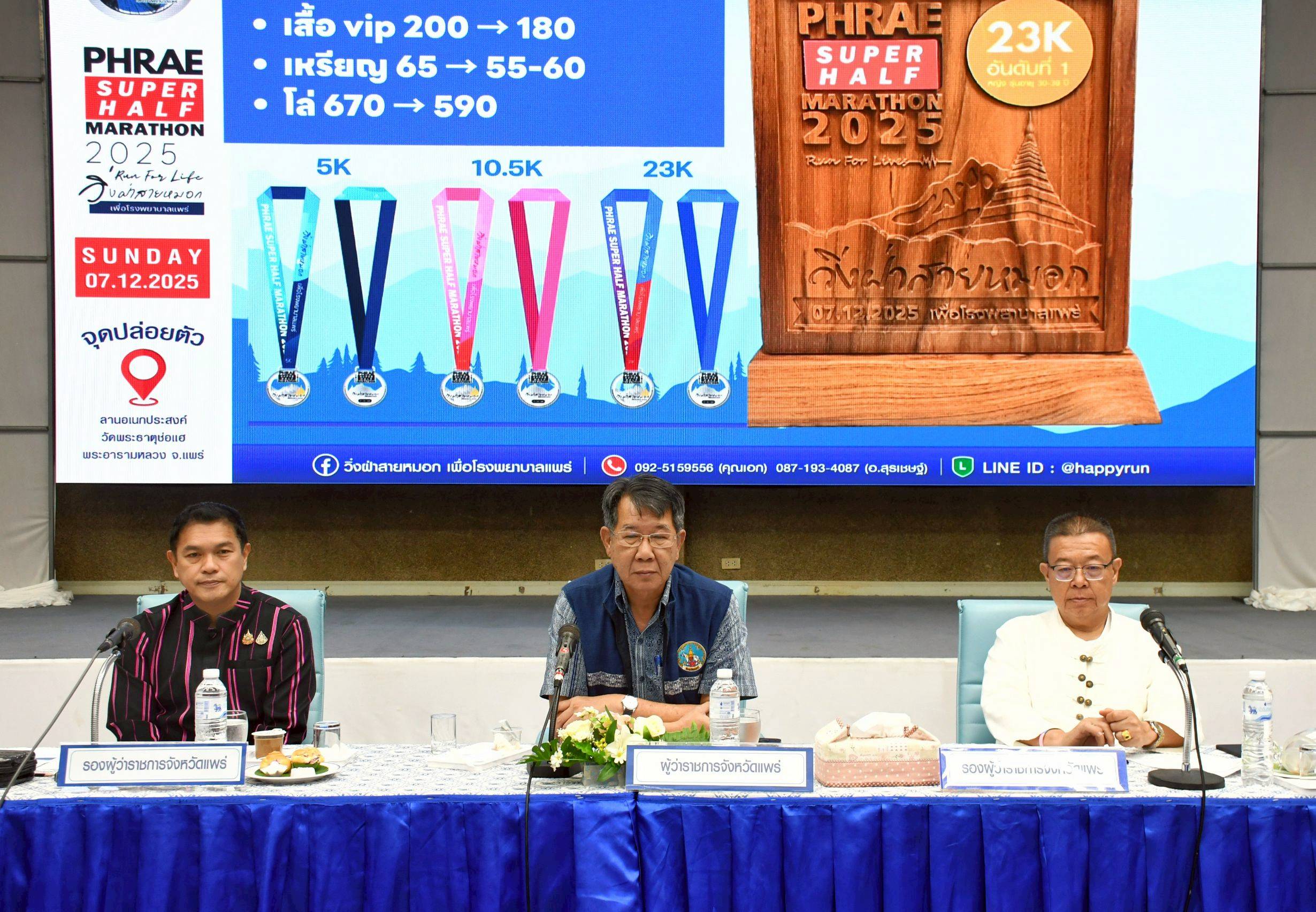 เมื่อเวลา 09.30 น.วันที่ 7 ตุลาคม 2568 ที่ห้องประชุมแก้วโกศัย ชั้น 6 อาคารเฉลิมพระเกียรติ โรงพยาบาลแพร่ นายสมชัย เลิศประสิทธิพันธ์ ผู้ว่าราชการจังหวัดแพร่ เป็นประธานการประชุมเตรียมการจัดกิจกรรม “วิ่งฝ่าสายหมอก PHRAE SUPER HALF MARATHON 2025” โดยมี นายคุณากร คชหิรัญ และนายชัยสิทธิ์ ชัยสัมฤทธิ์ผล รองผู้ว่าราชการจังหวัดแพร่ พร้อมด้วยคณะกรรมการการจัดงานเข้าร่วมประชุม เพื่อระดมทุนจัดซื้ออุปกรณ์ทางการแพทย์ที่จำเป็นและเร่งด่วนสำหรับโรงพยาบาลแพร่ โดยเปิดโอกาสให้ประชา