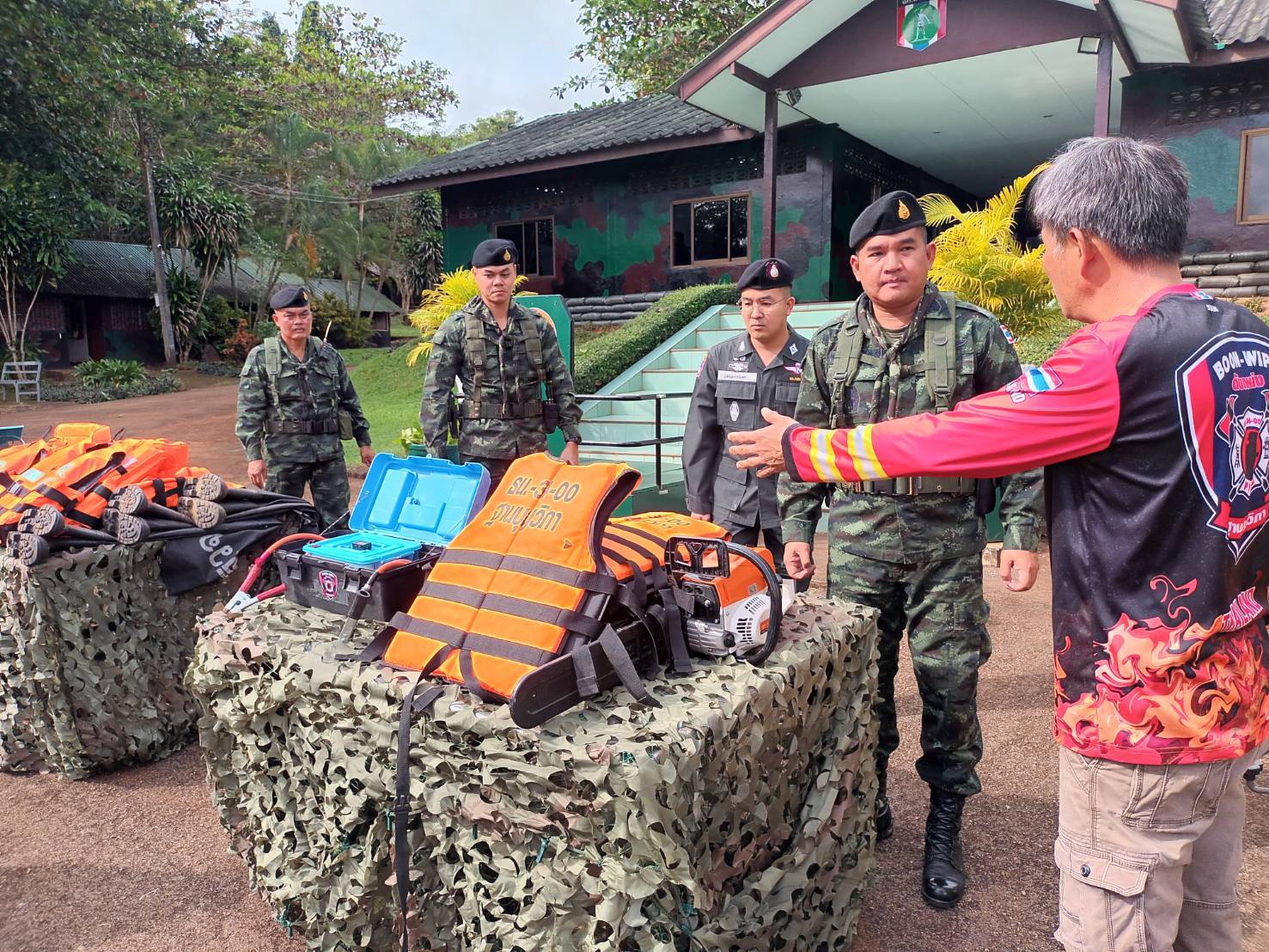 วันนี้ 9 ต.ค.68 ผู้สื่อข่าวรายงานว่า พลตรี ณัฏฐพงศ์ อัศวินวงศ์ ผู้บัญชาการกองพลทหารราบที่ 9 ในฐานะ ผู้อำนวยการศูนย์บรรเทาสาธารณภัย กองพลทหารราบที่ 29 และผู้บัญชาการกองกำลังสุรสีห์ จึงสั่งการให้ พันเอก พรรณศักย์ เพรียวพานิช ผู้บังคับการกรมทหารราบที่ 29 ในฐานะ ผู้อำนวยการศูนย์บรรเทาสาธารณภัย กรมทหารราบที่ 29 และผู้บังคับหน่วยเฉพาะกิจลาดหญ้า กองกำลังสุรสีห์ พร้อมด้วย พันเอก ปิยะเณศร์ ภัทรศาศวัตวงษ์ รองผู้บังคับหน่วยเฉพาะกิจลาดหญ้า กองกำลังสุรสีห์ ร่วมกับ กองร้อยตำรวจตระเวนชายแดนที่ 135 และ มูลนิธิหน่วยบรรเทาสาธณภัยแห่งประเทศไทยฐานบุญวิภา อำเภอทองผาภูมิ จังหวัดกาญจนบุรี ทำการตรวจความพร้อมการช่วยเหลือประชาชน และอุปกรณ์เครื่องมือบรรเทาสาธารณภัยของหน่วย ณ กองบังคับการหน่วยเฉพาะกิจลาดหญ้า ซึ่งประกอบด้วย อาทิ อุปกรณ์ตรวจวัดกระแสไฟฟ้ารั่ว วิทยุสื่อสาร ไฟฉาย เสื้อชูชีพ ชุดเครื่องมือช่าง อุปกรณ์ปฐมพยาบาลเบื้องต้น รถยนต์บรรทุก (FTS) รวมถึงเรือท้องแบน เครื่องปั่นไฟและให้แสงสว่าง เครื่องมือช่วยเหลือ และ ชุดเสนารักษ์เคลื่อนที่ เป็นต้น เพื่อเป็นการเตรียมความพร้อมแผนการปฏิบัติในการช่วยเหลือประชาชนผู้ประสบภัยพิบัติต่าง ๆ กรณีเกิดภัยพิบัติจะสามารถดำเนินการเข้าช่วยเหลือได้อย่างรวดเร็วทันต่อสถานการณ์ โดยกำลังพลทุกนายล้วนมีความพร้อมตามที่ได้ฝึกมาเป็นอย่างดี