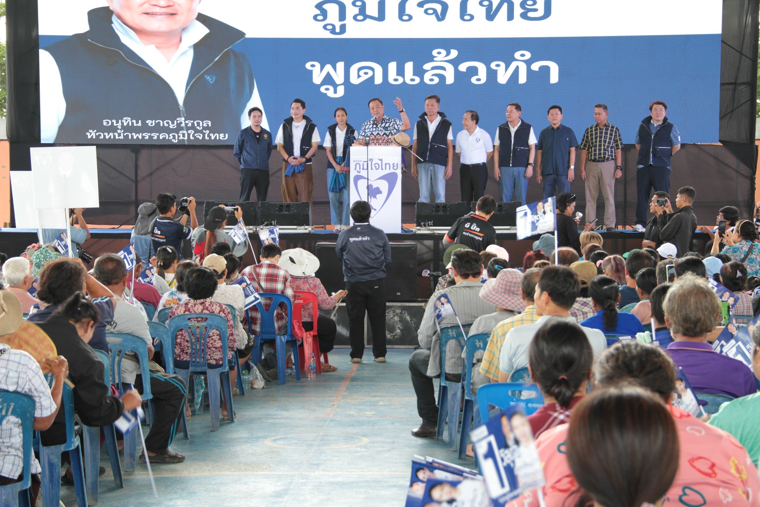 ทั้งนี้ เมื่อถึงเวที นายอนุทิน เดินทักทายประชาชนตั่งแต่ชาวบ้านรอรับคนแรก ก่อนมีคุณลุงได้มอบหมวกให้กับนายกอนุทิน ใส่กันแดดที่ร้อนจัด และลงไปนั่งถ่ายรูปด้วย จากนั้นนายอนุทิน ขึ้นกล่าวปราศรัยตอนหนึ่งว่า ตนมาในฐานะหัวหน้าพรรคภูมิใจไทย มาขอบคุณประชาชน ที่คราวที่แล้วเลือกนายศักดิ์ดา ไปเป็น สส. ของคนเมืองกาญจน์ แต่ตนเห็นว่านายศักดิ์ดา น่าจะรับใช้ประชาชนได้มากกว่า จึงชวนมาเป็นรัฐมนตรี นายศักดิ์ดา จึงต้องลาออกจาก สส. แต่เรามีลูกสาวมารับใช้ประชาชนไม่ให้ขาดช่วง คราวนี้ได้ทั้งพ่อทั้งลูก