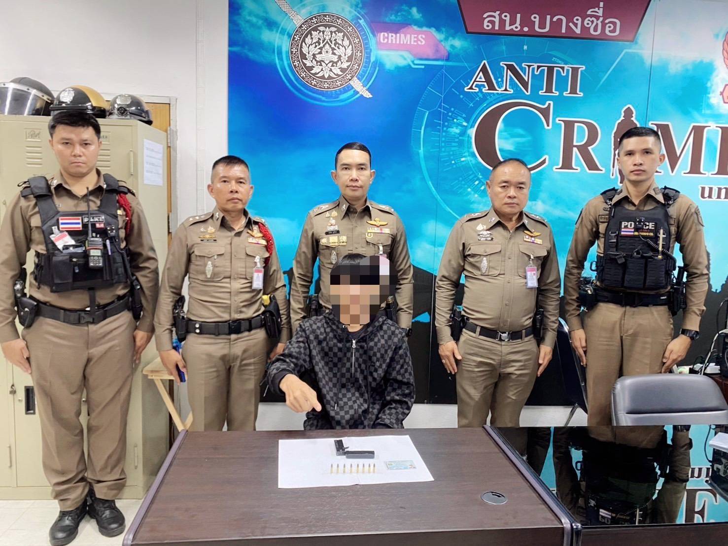 วันที่ 14 ตุลาคม 2568 เจ้าหน้าที่ตำรวจฝ่ายป้องกันและปราบปราม สน.บางซื่อ ภายใต้การอำนวยการของ พ.ต.อ.สนอง แสงมณี ผกก.สน.บางซื่อ มอบหมายให้ พ.ต.ท.วรภัทร สุขไทย รอง ผกก.ป.สน.บางซื่อ พร้อมด้วย พ.ต.ท.วุฒิเดช พ่อค้า สวป.สน.บางซื่อ, ร.ต.อ.คนอง ดอนเสือ รอง สวป.สน.บางซื่อ และเจ้าหน้าที่สายตรวจชุดที่ 2 เข้าทำการจับกุมผู้ต้องหาพกพาอาวุธปืนโดยไม่ได้รับอนุญาต ภายในสถานีขนส่งผู้โดยสารกรุงเทพฯ (จตุจักร) แขวงจตุจักร เขตจตุจักร กรุงเทพฯ
