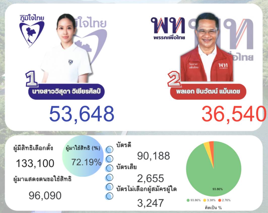 นางสาววิสุดา วิเชียรศิลป์ ภูมิใจไทย 53,648 (ห้าหมื่นสามพันหกร้อยสี่สิบแปด) พลเอกชินวัฒน์ แม้นเดช เพื่อไทย 36,540 (สามหมื่นหกพันห้าร้อยสี่สิบ) รวมคะแนนทั้งสิ้น 90,188 (เก้าหมื่นหนึ่งร้อยแปดสิบแปด) ประกาศ ณ วันที่ 19 เดือน ตุลาคม พ.ศ. 2568 ลงนามโดย นายเกียรติศักดิ์ ธนาวรรณโอภาส ประธานกรรมการการเลือกตั้งประจำเขตเลือกตั้ง พ.ต.อ.สิทธิพงศ์ สังข์แสง กรรมการการเลือกตั้งประจำเขตเลือกตั้ง นายชยันต์ เพชรศรีจันทร์ กรรมการการเลือกตั้งประจำเขตเลือกตั้ง