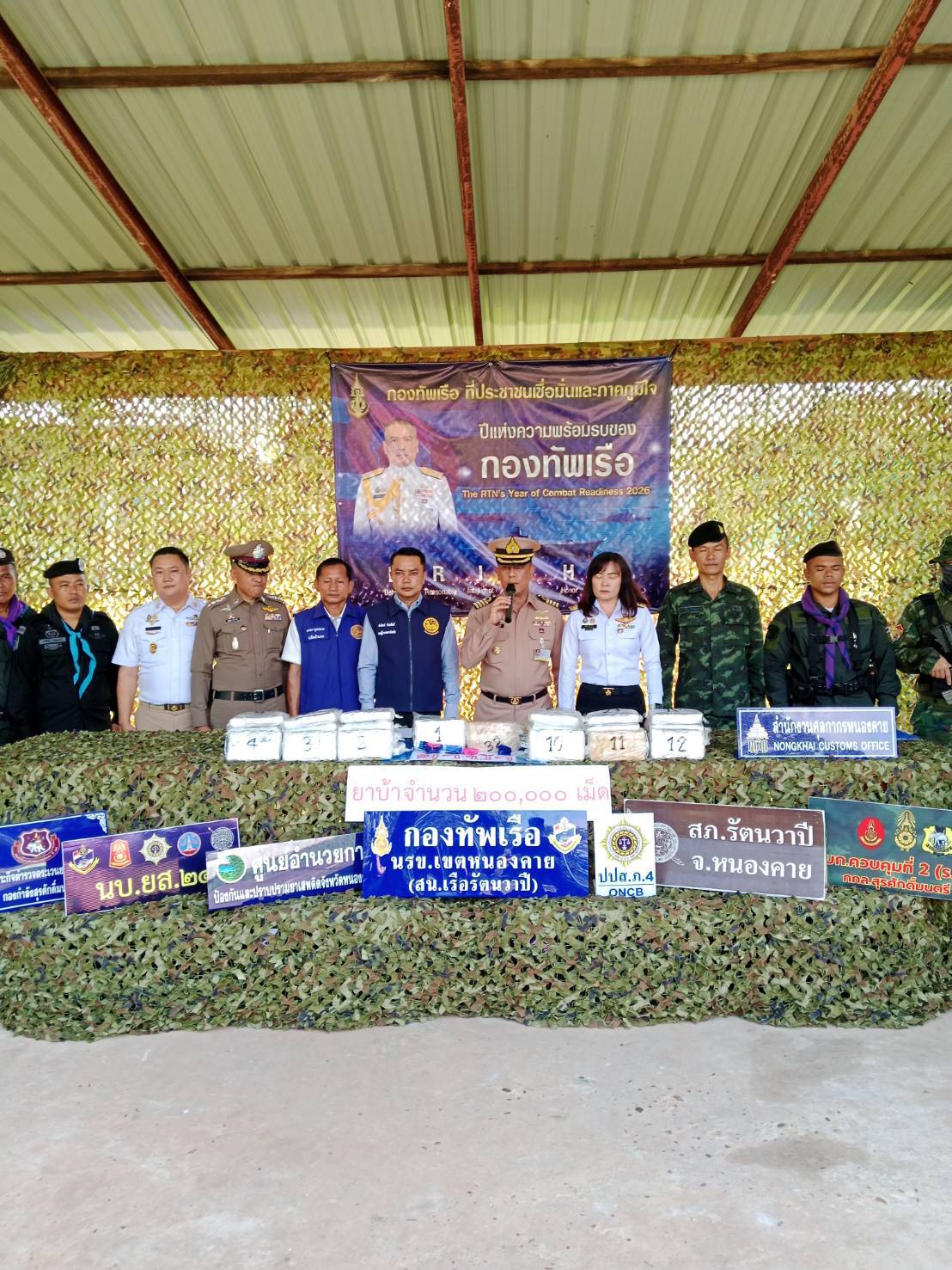 วันที่ 20 ต.ค.68 เวลา 14.00 น. ที่สถานีเรือรัตนวาปี นรข.เขตหนอวคาย อ.รัตนวาปี จ.หนองคาย นายจำลักษ์ กันเพ็ชร์ รองผู้ว่าราชการจังหวัดหนองคาย พร้อมด้วย น.อ.วิศิษฐ์พงศ์ เจริญวิชยเดช ผบ.นรข.เขตหนองคาย ,นางสาววรรณา ผู้อุตส่าห์ นายด่านศุลกากรหนองคาย ,พ.ต.อ.ปริวัฒน์ สัจจาพันธ์ ผกก.สภ.รัตนวาปี ,ร.อ.ไชยา เนียมแสง หัวหน้าสถานีเรือรัตนวาปี ,นายชัยสิทธิ์ คำภาจันทร์ หน.ศูนย์ ปปส.จว.นค. นายอเนก บุระพวง ผู้แทนนายอำเภอรัตนวาปี ,ร.ต.ไชโย หรพูน ผู้แทน กกล.สุรศักดิ์มนตรี ร.ท.ปรัชญา จันทะวัน ผู้แทน ผบ.ร้อย ฉก.ทพ.2104 ร.ต.ต.เสกสรร เทียนปรุ ผู้แทน ผบ.ร้อย ตชด.244 และหน่วยงานที่เกี่ยวข้อง ได้ร่วมกันแถลงผบดารตรวจยึดยาบ้า 200,000 เม็ด รถยนต์เก๋ง 1 คัน