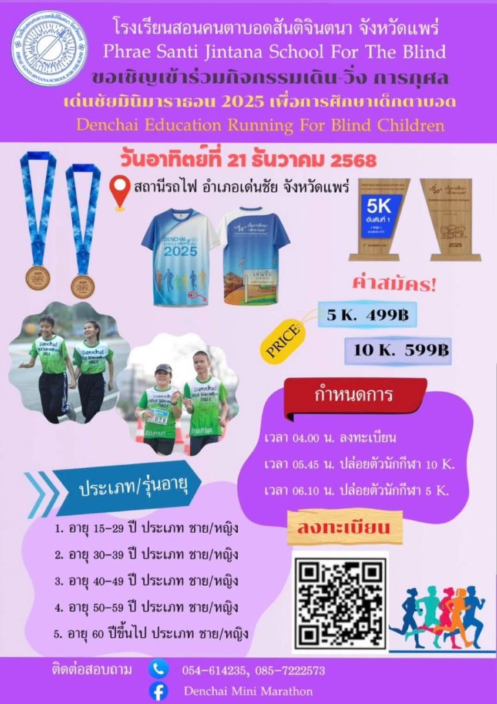 สำหรับกิจกรรม เดิน-วิ่งการกุศล เด่นชัย มินิมาราธอน 2025 เพื่อการศึกษาเด็กตาบอด Denchai Mini Marathon 2025 Education running for blind children วันอาทิตย์ที่ 21 ธันวาคม 2568 จุดเริ่มต้นหน้าสถานีรถไฟเด่นชัย อำเภอเด่นชัย จังหวัดแพร่ รายได้เพื่อการสนับสนุนการศึกษา และพัฒนาคุณภาพชีวิตเด็กตาบอด ในการจัดซื้อ จัดหาอุปกรณ์ ครุภัณฑ์ในการจัดกระบวนการเรียนรู้สำหรับเด็กตาบอด