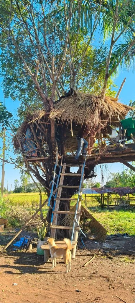 น.ส.เจนจิรา ทุมมา กล่าวว่า สามีของตนเห็นว่ากิ่งไม้รกบังสายไฟฟ้าจึงได้ตัดแต่งกิ่งออก และเกิดแนวคิดอยากทำบ้านต้นไม้อยู่ด้านบน จึงได้นำๆม้ยูครลิปตัส ไม้ไผ่ และไม้อื่นๆขึ้นไปต่อเติมพอให้คนขึ้นไปนั่งได้ 5-6 คน พื้นปูด้วยไม้ไผ่ทาสีกันปลวก บันไดทำด้วยไม้ยูคา มั่นคงแข็งแรง จะขี้นไปพักผ่อนกลางวันเย็นสบาย จะสังสรรค์ก็นั่งสบายได้ 5-6 คน ส่วนตนเวลากลางคืนใช้ทำเป็นที่นอนมานานหลายเดือนจนลืมบ้านที่อยู่ข้างล่าง ส่วนใครที่จะเอาไปเป็นตัวอย่างเจ้าของไม่หวง ฟรืออยากจะมาชมก็สามารถติดต่อที่เบอร์ 0980735035