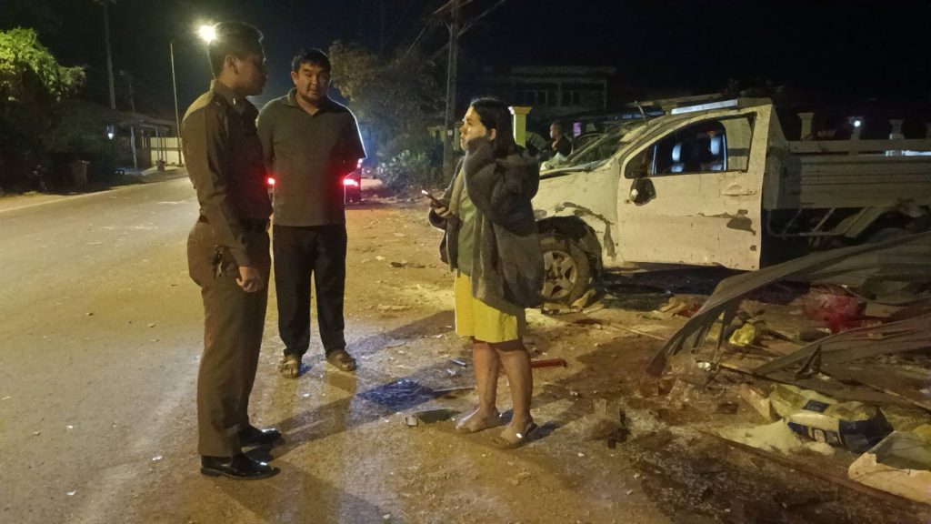 นายอนุสรณ์ ละบุญเรือง อายุ 44 ปี เจ้าของบ้าน และนางสาวรัตนาภรณ์ บุตรศรีขัน อายุ 41 ปี สองสามีภรรยา กล่าวว่าช่วงประมาณตี 3 ขณะกำลังพักผ่อนอยู่ภายในบ้านได้ยินเสียงดังบึ้มเสียงดังมาก จึงสะดุ้งตื่นลุกออกมาพบกลุ่มควันสีขาวฟุ้งกระจายเต็มตัวบ้าน จึงเรียกภรรยาและลูกให้ออกมาจากตัวบ้าน และพบว่าบริเวณหน้าบ้านถูกรถยนต์กระบะพุ่งชนบริเวณหน้าบ้าน รถยนต์คันดังกล่าวถูกแรงกระแทกโครงเหล็กของตัวบ้านกระเด็นออกมาจอดห่างจากตัวบ้าน 3เมตร โดยนางสาวรัตนาภรณ์ถูกกระจกบาดที่ขาขวาได้รับบาดเจ็บเล็กน้อย ที่เหลือไม่ได้รับบาดเจ็บแต่อย่างใด สาเหตุคาดว่าน่าจะเกิดจากคนขับซึ่งเป็นคนต่างชาติเมาคำดังกล่าวมา ก่อนถึงบ้านหลังดังกล่าวเป็นทางโค้งเล็กน้อยทำให้รถเสียหลักพุ่งชนบ้านพังเสียหาย ตำรวจอยู่ระหว่างติดต่อคนขับเพื่อสอบ